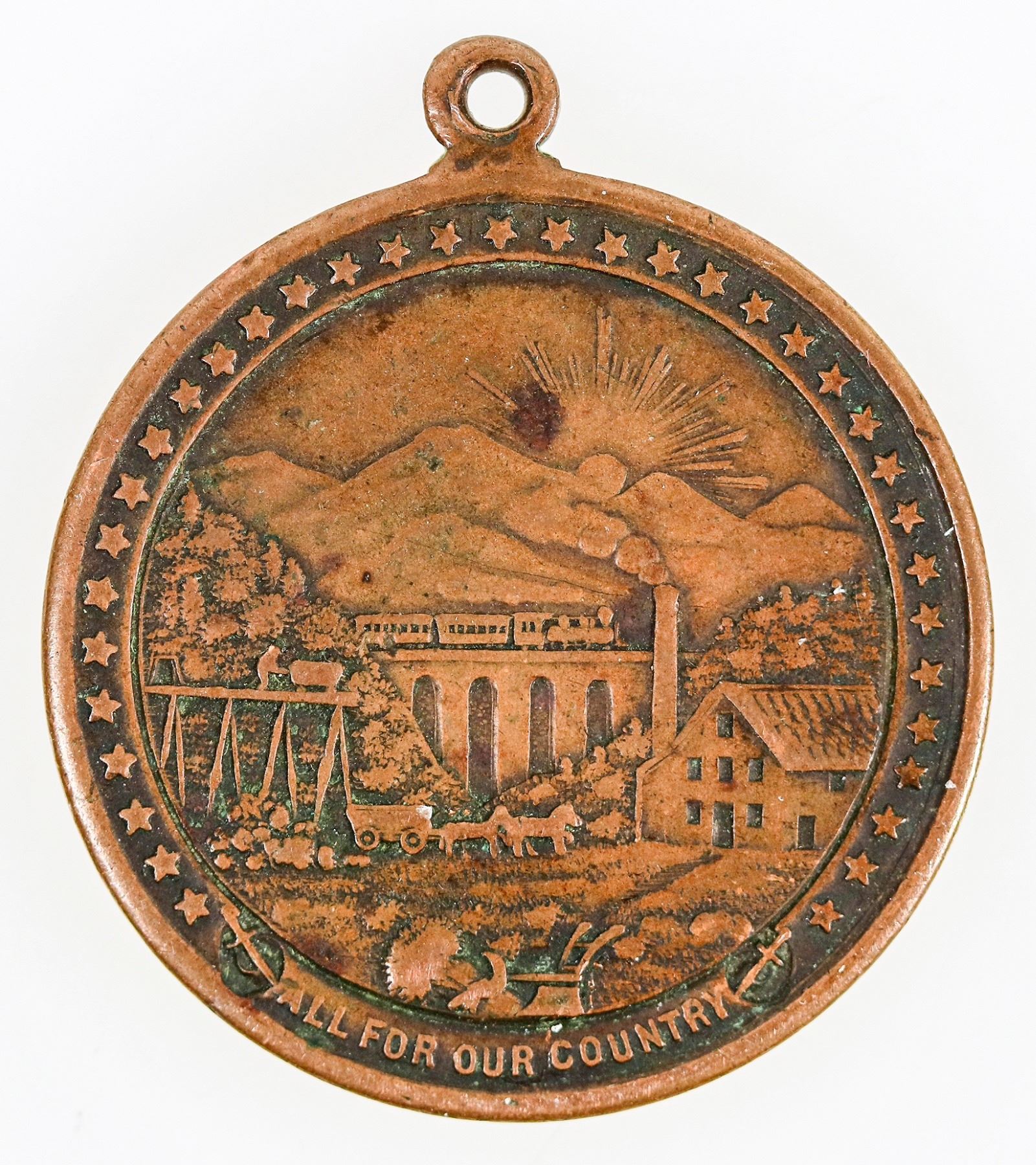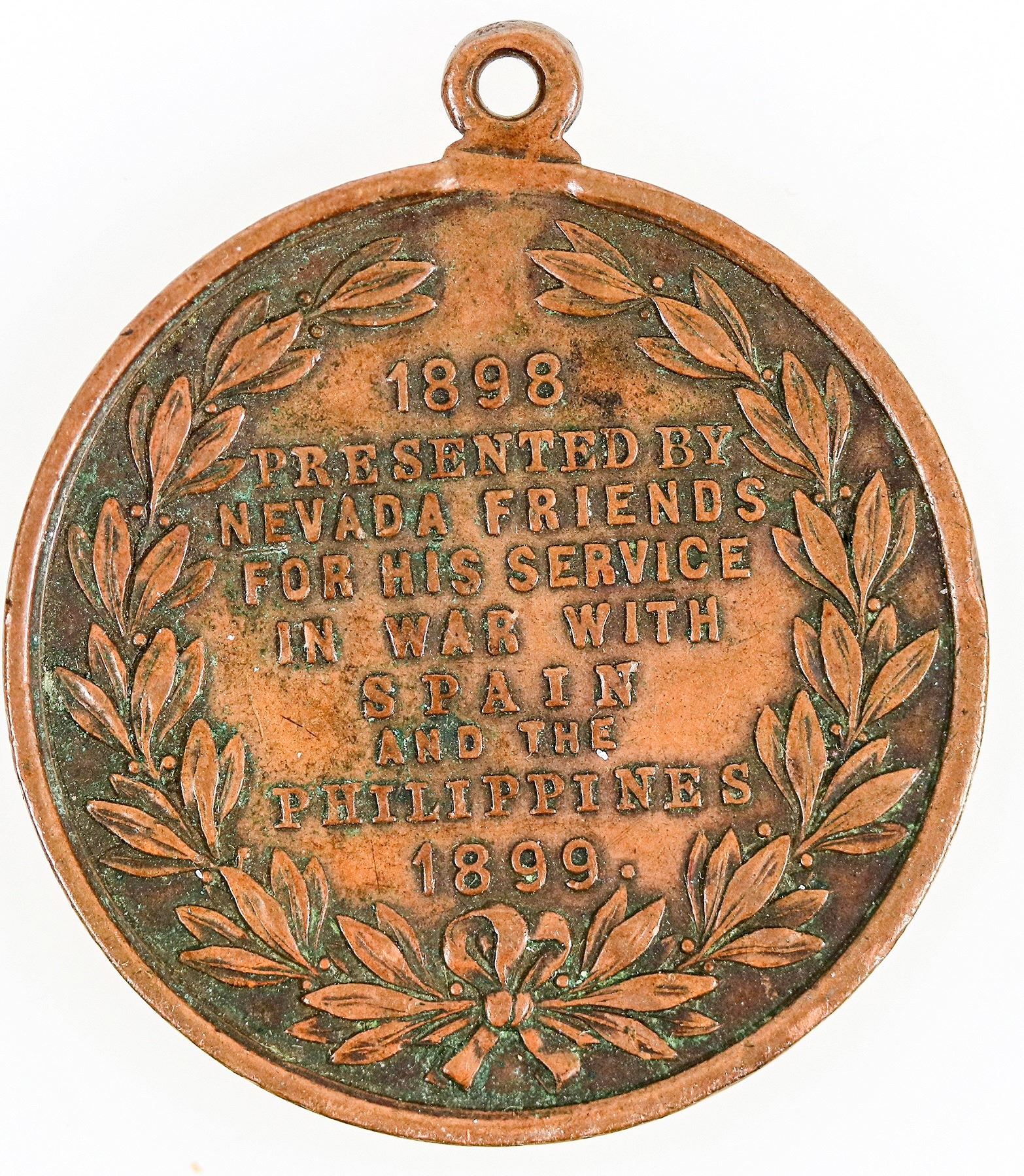 Medal, with a suspension loop, is inscribed "1898/Presented by Nevada Friends/For His Service/in War With/Spain/and the Philippines/1899" on the obverse, and a detailed rendering of the Nevada State Seal on the reverse. In 1898 the Nevada Volunteers were organized to assist the US Army in fighting the Spanish. The Nevada Volunteer Cavalry went to Cuba to fight alongside Teddy Roosevelt's "Rough Riders," while the Nevada Volunteer Infantry was sent to the Philippines. After the war was over, a spirited group of friends commissioned a medal to be awarded to every man in the cavalry and infantry. However, it took so long to receive the finished medals that many men had dispersed and could not be found. After medals were presented to the men who could be found, the remainder were melted. That accounts for the real rarity of this piece. 1.25" diameter.