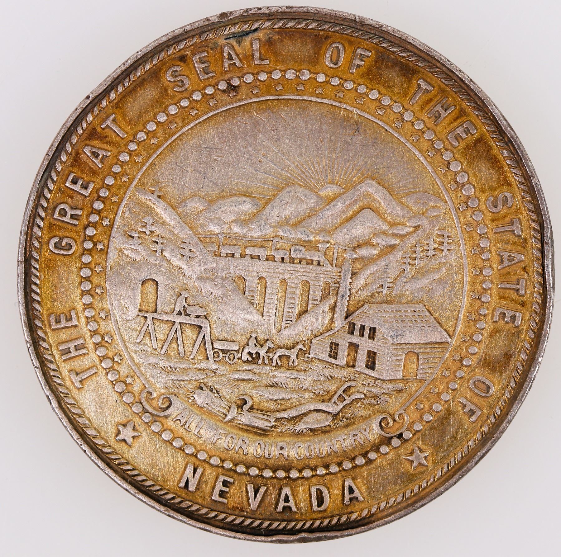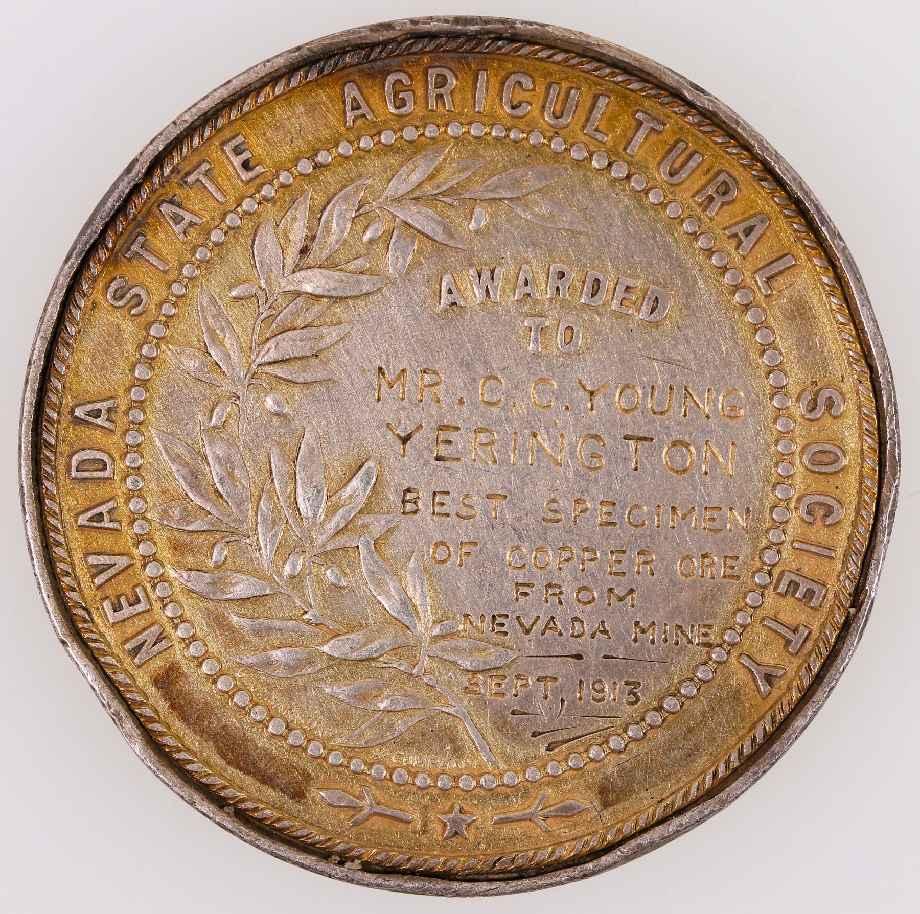 Silver medal awarded to Mr. C. C. Young of Yerington, for the best specimen of copper ore from a Nevada mine, Sept. 1913, by the Nevada State Agricultural Society. 45 mm, 44 grams, Excellent condition, light wear with minor rim dings.