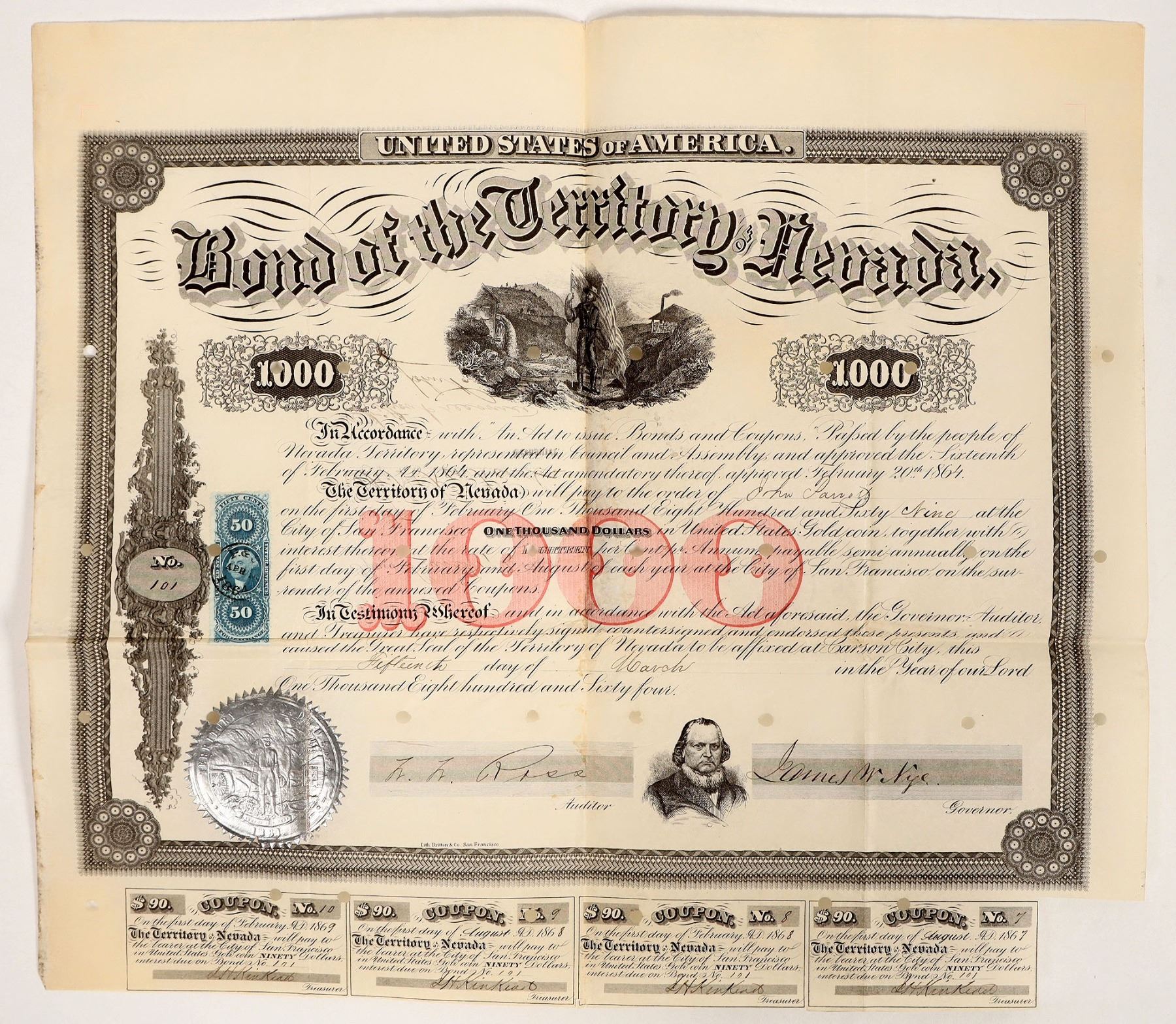 1864 Nevada Territory bond with governor James Nye signature. "Known affectionately as "Old Grey Eagle," JAMES WARREN NYE was born in DeRuyter, Madison County, New York. He was serving as President of the New York Metropolitan Board of Police when President Abraham Lincoln commissioned him as Governor of Nevada Territory on March 22, 1861. He then continued as Acting Governor of the new State of Nevada under the newly-adopted State Constitution prior to the swearing in of the first elected Governor, Henry G. Blasdel. On October 31, 1864, Nye's first action as Acting Governor was to certify President Lincoln' proclamation declaring Nevada a state. Nye went on to oversee the first state elections the following month, and made appointments prior to Henry Blasdel's swearing in that included judgeships, county commissioner positions, and military commissions. Immediately after leaving office, Nye was elected by the state legislature to one of Nevada's two new seats in the U.S. Senate. Because terms are staggered in the U.S. Senate both among and within states Nye and his new colleague in the Senate necessarily began Nevada's representation in Congress with different length terms, and Nye drew the shorter of the two, which ended in 1867. However, he was reelected by the legislature, serving another full Senate term of six years. Nye died on Christmas day in 1876 in White Plains, New York and was buried in Woodlawn Cemetery. The last territorial legislature of Nevada named a county in his honor." from nga.org