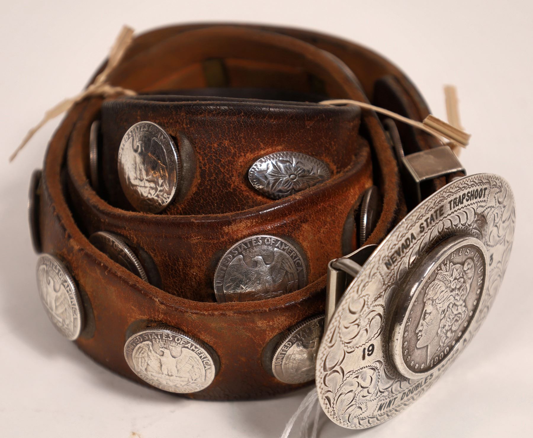 Sterling silver belt buckle holding a 1900 Morgan dollar; 44 inch belt decorated with 20 silver quarters.