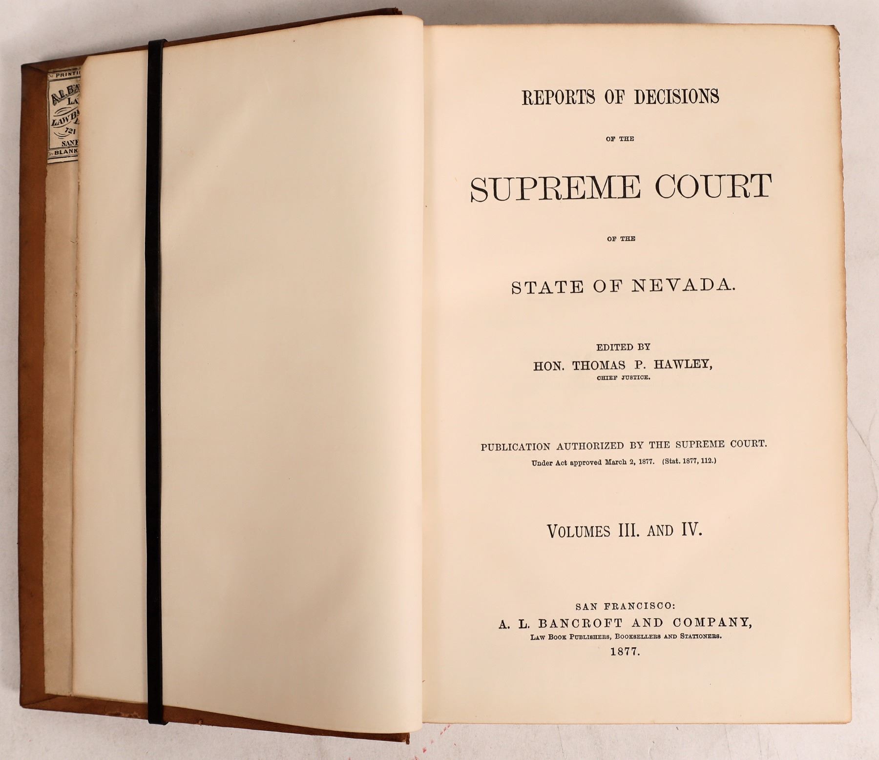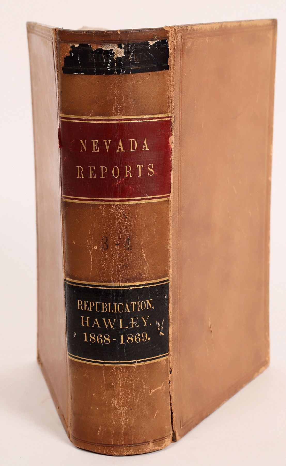 Nevada Reports of Decisions of the Supreme Court of the State of Nevada Vols III and IV, 1877 by Hawley. 1034pp. Court decisions from April 1867 to January 1869 with a number of important mining cases. Cover and spine have some wear and front lower spine crack, please inspect.