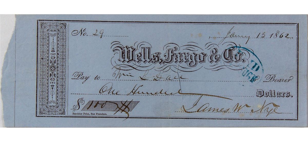 January 15, 1865 check number 29 to William S Ball for $100. Nice bold signature. Partial blue 'PAID' stamp.
