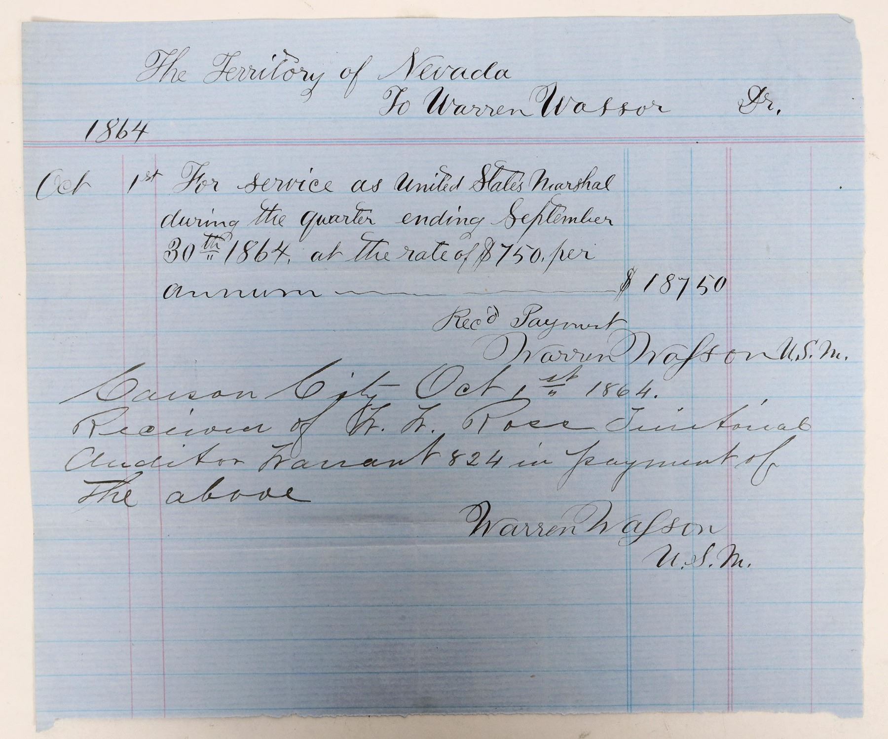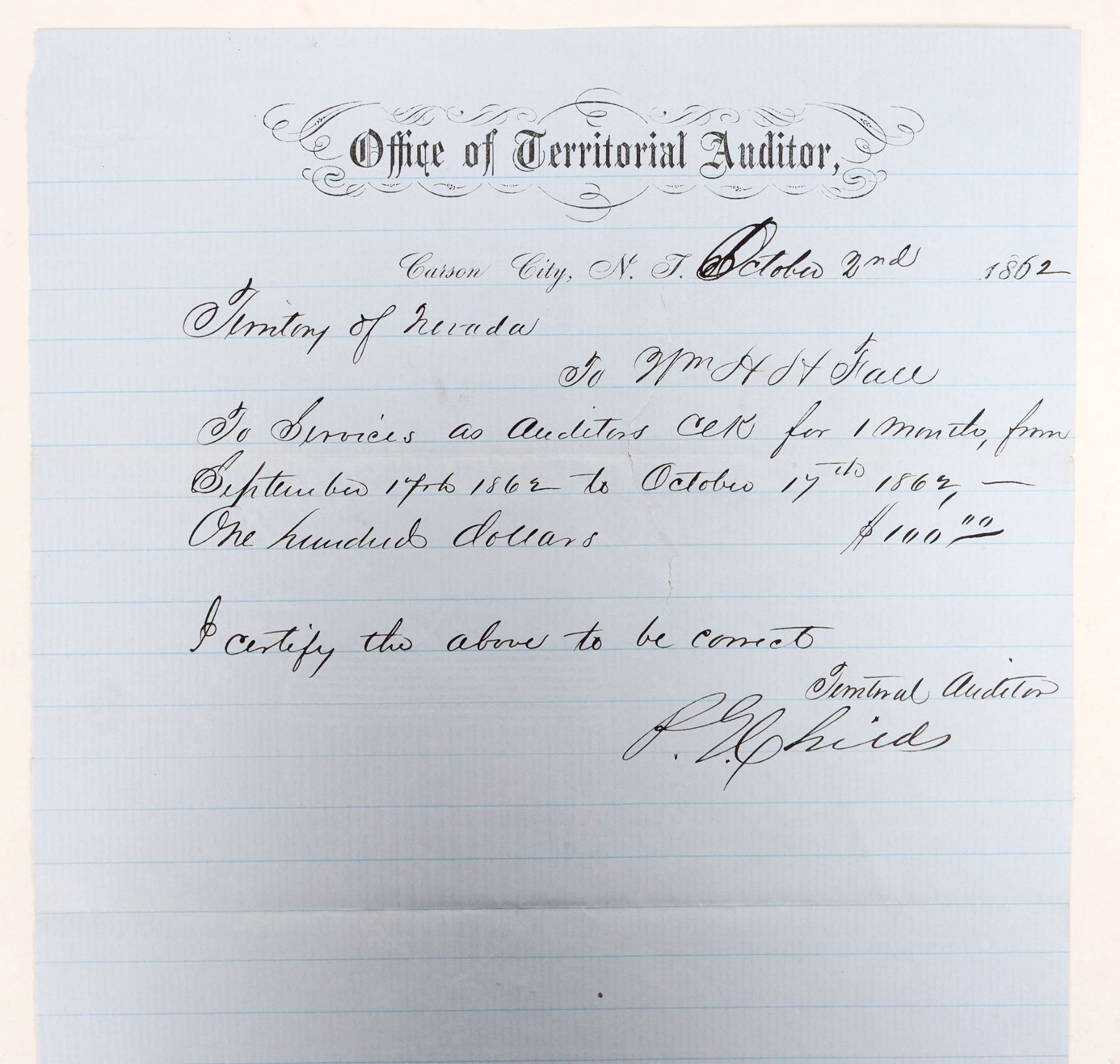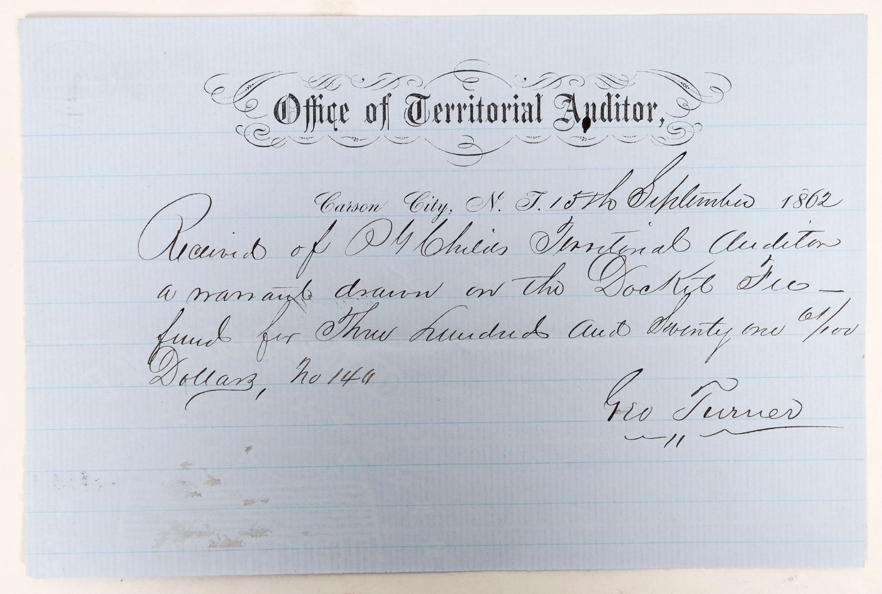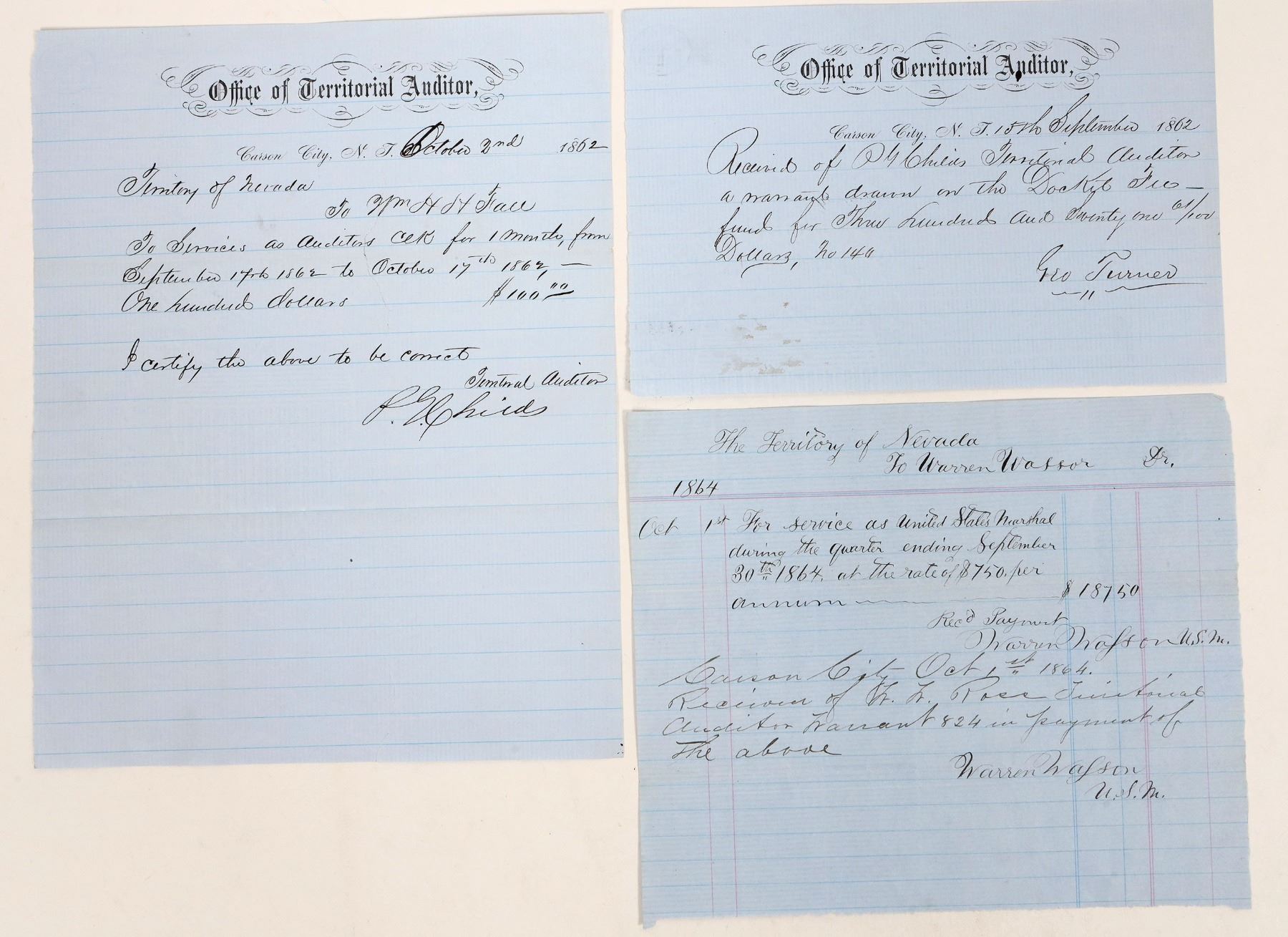 3 Nevada Territory documents on blue paper. 1862 Territorial Auditor receipt signed by Geo Turner, who was a Chief Justice appointee by Lincoln. He was from Ohio. Sam Clemens wrote an article about a speech by Turner. He was a lousy speaker and was only in NT for a year or two. 1862 Office of Territorial Auditor letterhead signed by P G Childs, Perry G. Childs served as the first Territorial Auditor from 1861-63-1.25" bottom tear. 1864 receipt to and signed by, Warren Wasson Sr., for services at the rate of $750 per annum. Chief Justice Turner appointed Wasson as Marshal. Not only was he the first U S Marshall in NT, he was also an Indian agent.