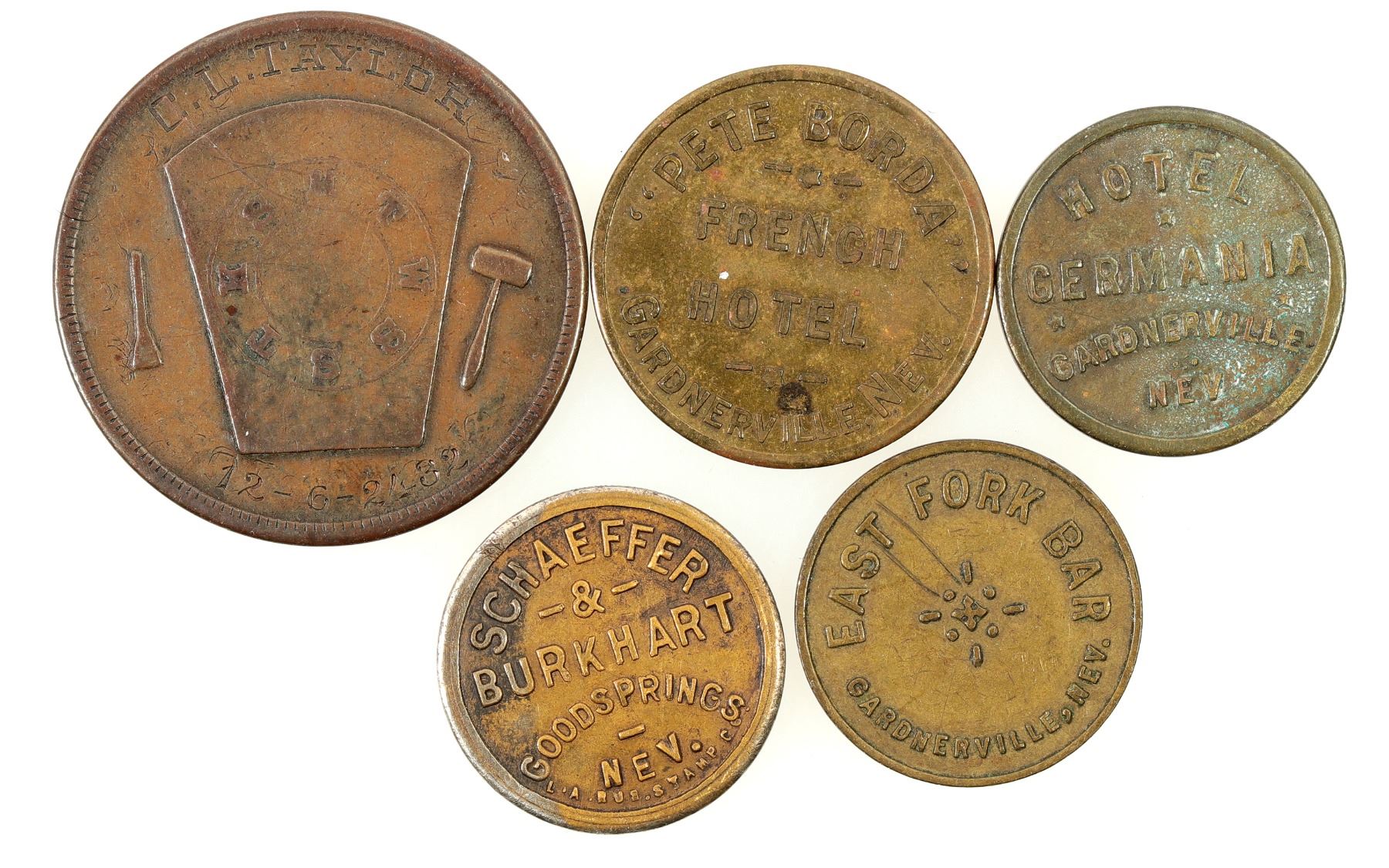 Lot of five Nevada tokens: three from Gardnerville: Pete Borda, Hotel Germania, East Fork Bar; Reno Chapter 7 R. A. M. penny; Schaeffer & Burkhart, Goodsprings, GF 12 1/2c in trade. Nevada