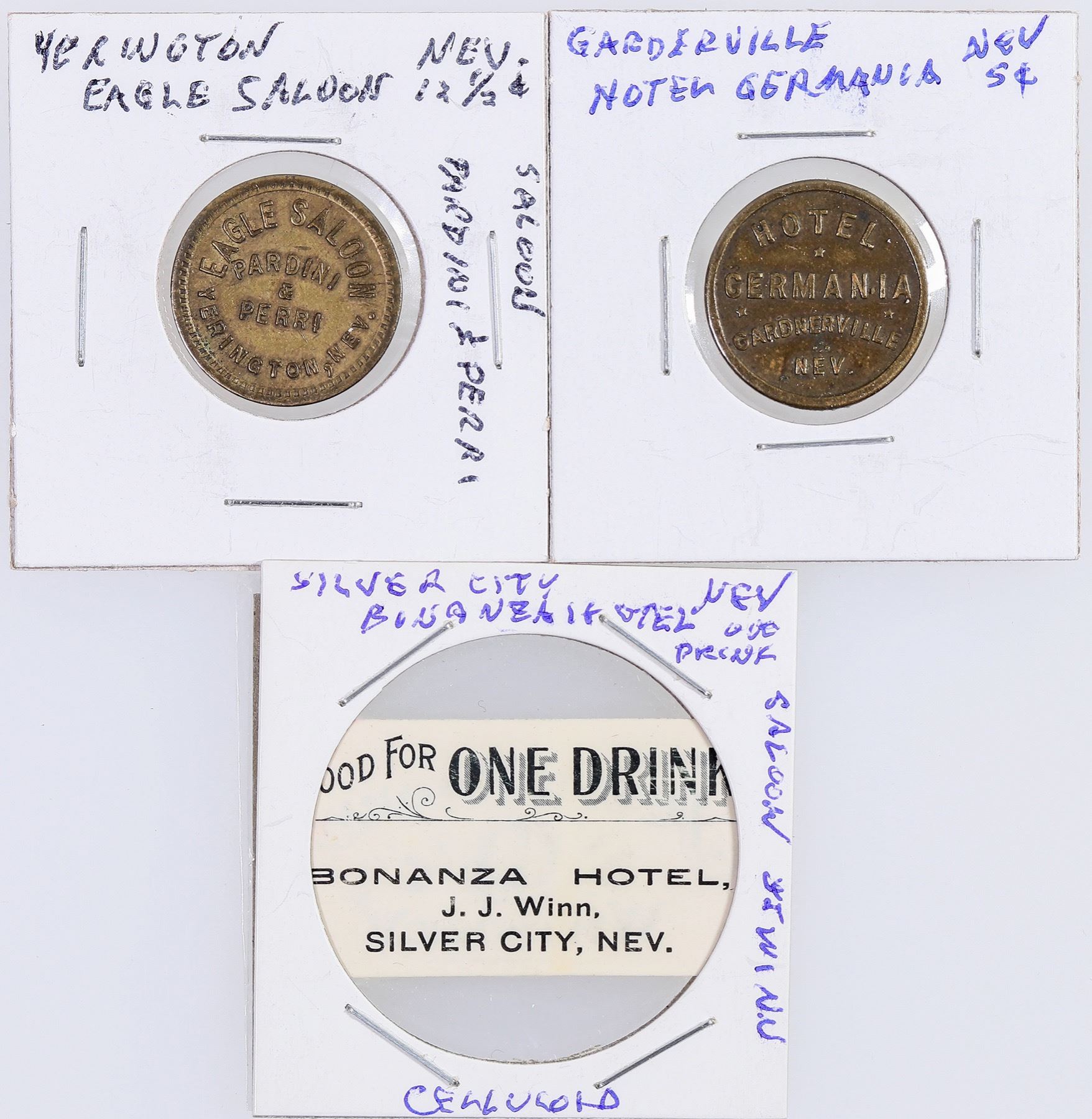 Three Nevada tokens: 1) GOOD FOR ONE DRINK / BONANZA HOTEL, / J.J. WINN, / SILVER CITY, NEV. // DRINK / JESSE MOORE / AA / WHISKEY / THE WHITEHEAD & HOAG CO. NEWARK, N.J. Ce., rect., 48 x 24 mm. 2) HOTEL / GERMANIA / GARDNERVILLE / NEV. // GOOD FOR / 5¢ / IN TRADE; Br., rd., 21 mm. (1907-1910). 3) EAGLE SALOON / PARDINI / & / PERRI / YERINGTON, NEV. // GOOD FOR / 12Ω¢ / IN TRADE; Br., rd., 21 mm.