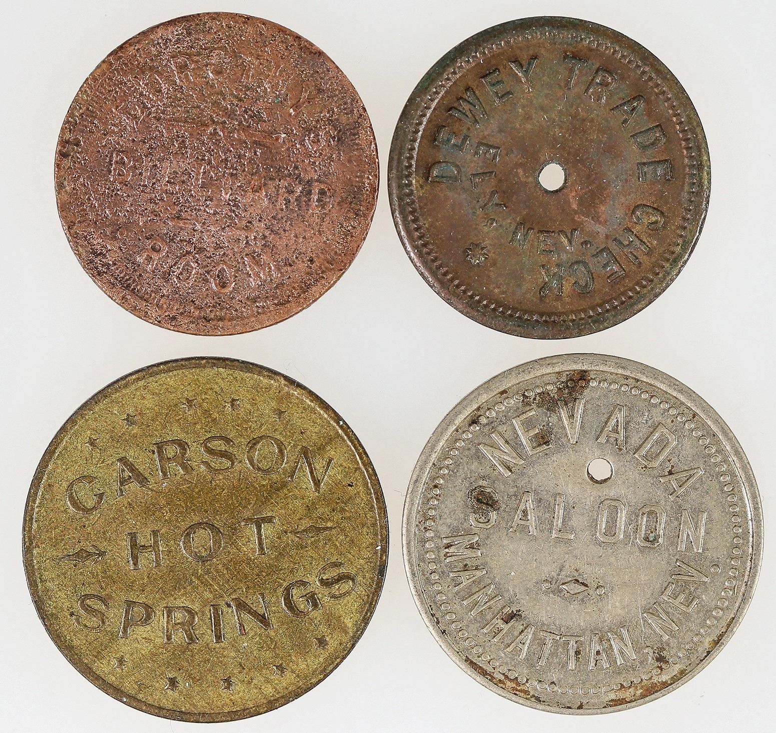 Lot of four Nevada tokens: 1) Manhattan: NEVADA / SALOON / MANHATTAN, NEV. // GOOD FOR / 25¢ / IN TRADE; Wm, rd., 24 mm, hole. 2) Carson City: CARSON / HOT / SPRINGS // GOOD FOR / 25 / CENTS / IN TRADE; Br., rd., 24 mm. 3) Ely: DEWEY TRADE CHECK / ELY, NEV. // GOOD FOR / 5¢ / IN TRADE (2mm center hole); Br., rd., 21 mm. Pioche: DORTHY'S / BILLIARD / S.L / STAMP / CO. / ROOM // (blank) ; Br., rd., 21 mm.