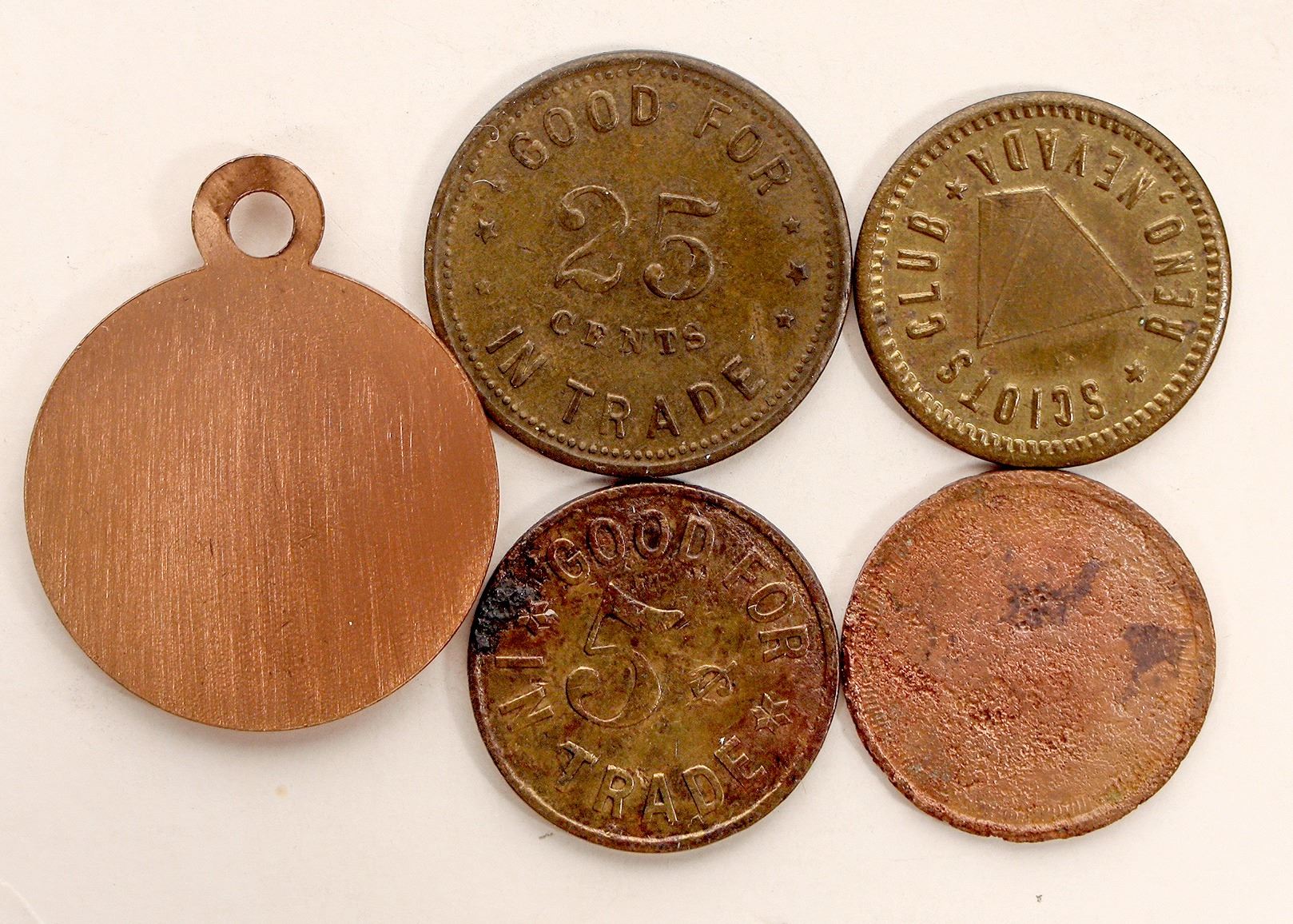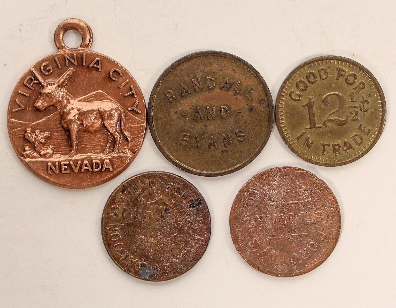 Small group of five: 1) Virginia City burro; bronze, 26 mm, with loop; 2) Tonopah: Balkan Saloon / Sam Umis / Tonopah, Nev. // Good For / 5 c / In Trade; Br., rd., 21 mm. 3) Randall / and / Evans // Good For / 25 / cents / In Trade; Br. rd., 24 mm. 4) Pioche: DORTHY'S / BILLIARD / S.L / STAMP / CO. / ROOM // (blank); Br. rd., 21 mm. 5) SCIOTS CLUB / (Masonic symbol) / RENO, NEVADA // GOOD FOR / 12Ω¢ / IN TRADE; Br., rd., 21 mm.
