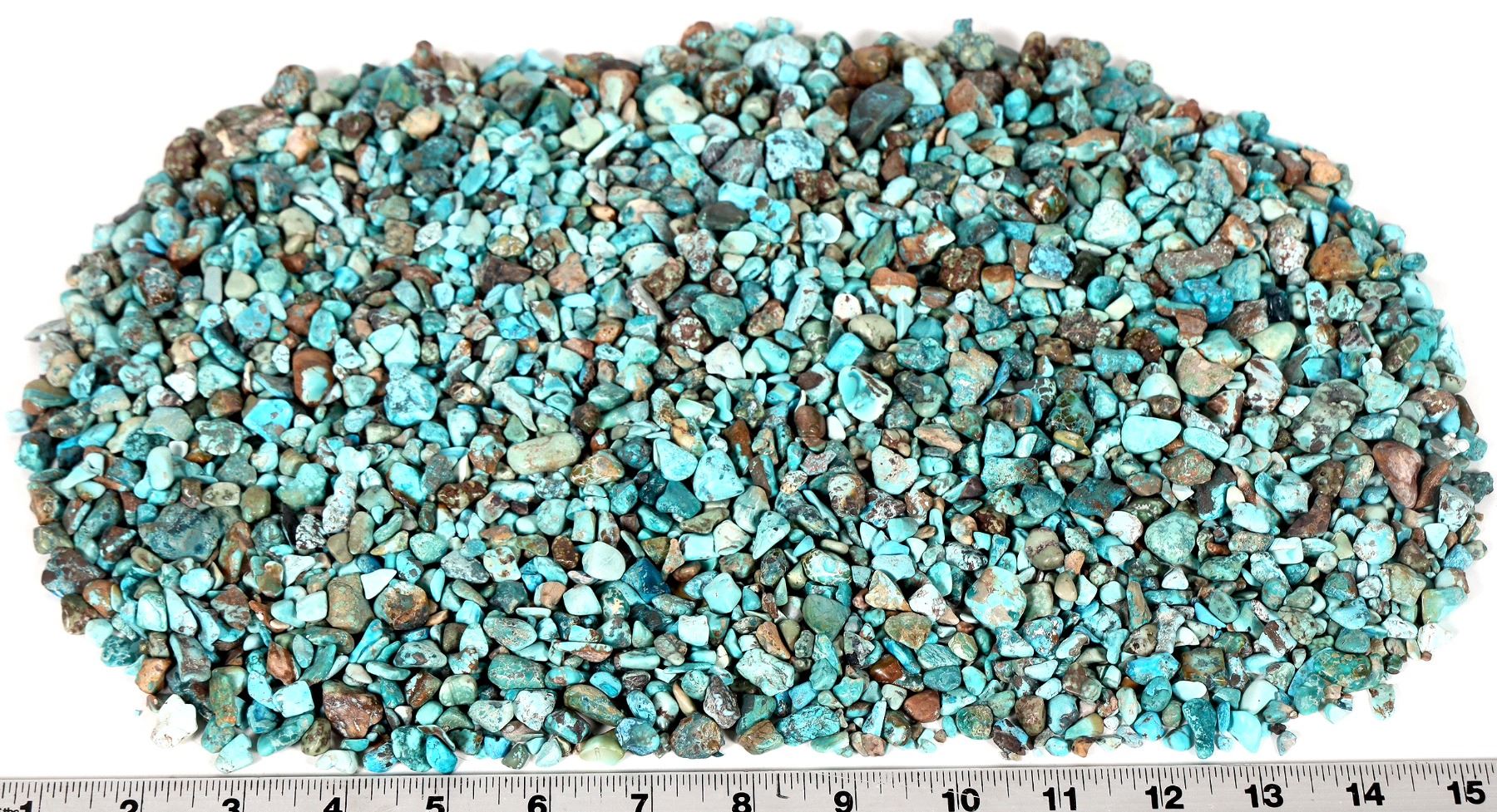Small turquoise nuggets, all treated, ranging from deep green-blue to pale blue in color. Approximate weight 1350 grams. Pieces in the lot range from around .2" to 1" in length, with most beneath .5". This turquoise originates from Nevada; it was treated around 30 years ago by a professor at the University of Nevada, Reno, who was conducting pioneering experiments in turquoise stabilization techniques. These would be great pieces for use in earrings, necklaces, or other jewelry. Great color variation throughout the lot.