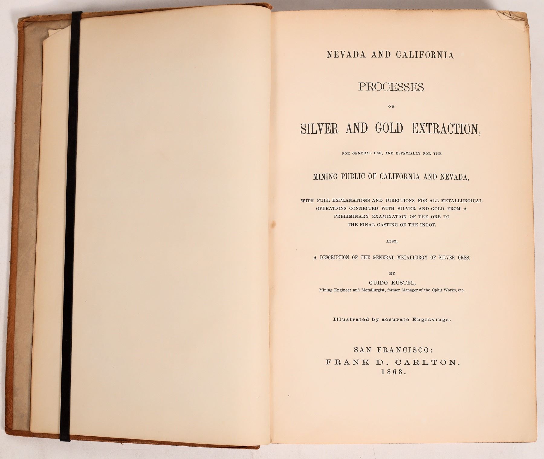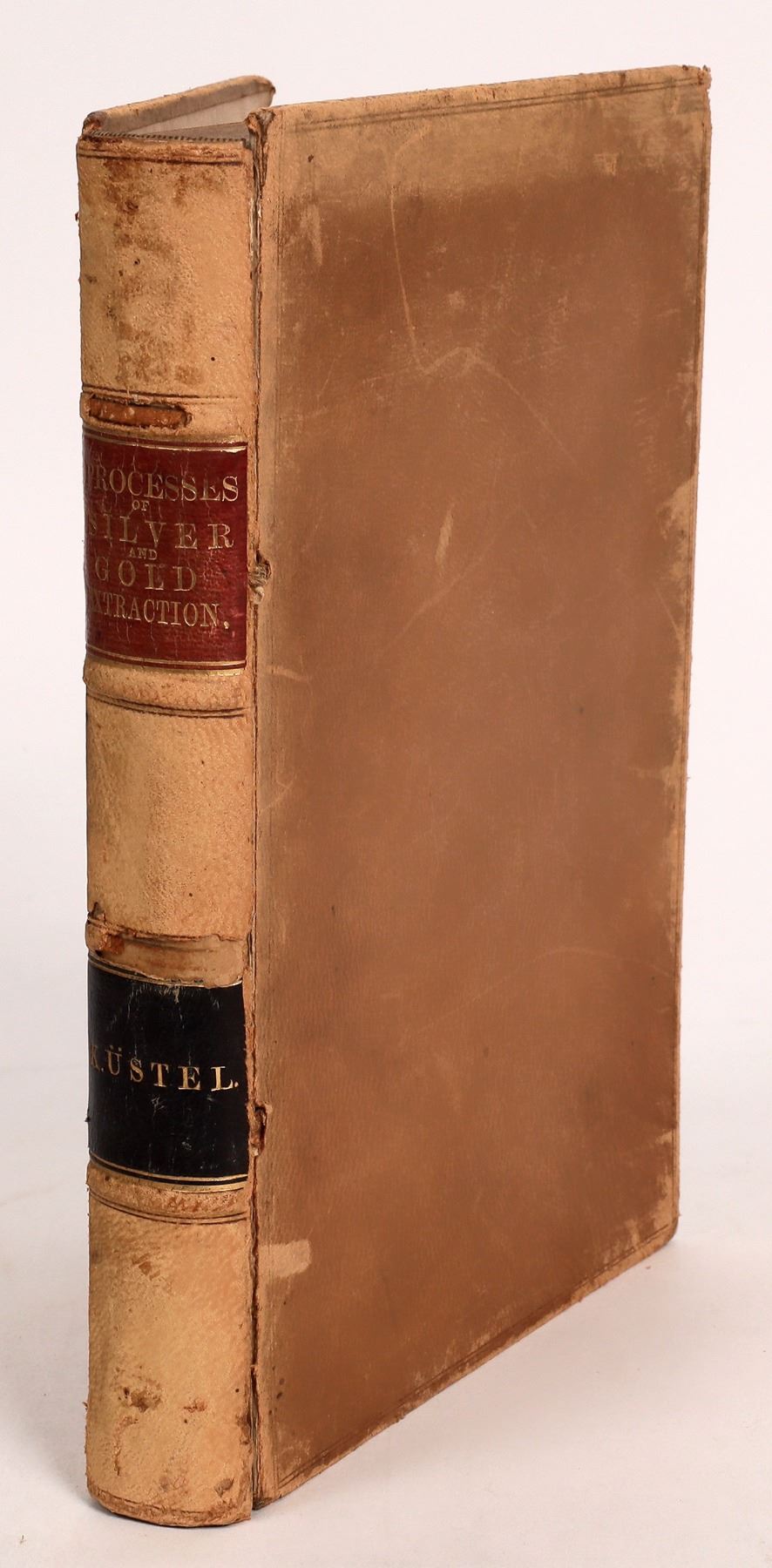 First Edition. Nevada and California Processes of Gold and Silver Extraction by Guido Kustel, 1863. Signed by the author to J. (John) Young 1863 (year of publication) who was the former Superintendent of the New Almaden Quicksilver Mine. Kustel was an early mining engineer who developed methods to process gold and silver ores of the Comstock Lode. Preliminary examination of operations from mining gold and silver to the final casting of the ingot. Illustrations of furnaces, assay gear and more. 327pp with index and 11 plates. PAHER 1059: "This rare volume describes gold and silver ore as they are found in California and Nevada Territory and gives details about different mining methods and milling processes. The author wrote the book at Dayton, the gateway to the silver excitement of the Comstock, in the spring of 1863." Inner front spine splitting, dog ears on first few pages.