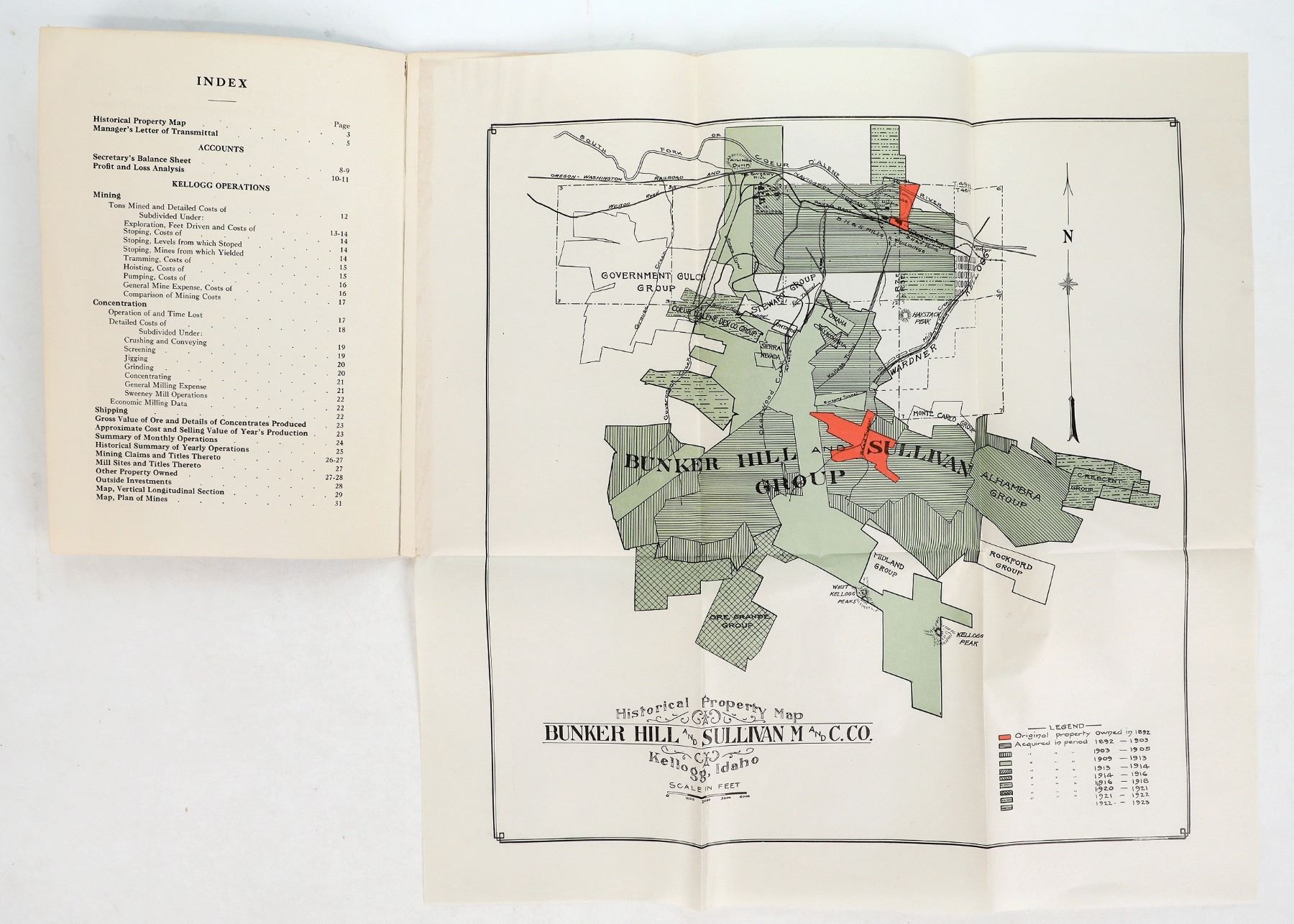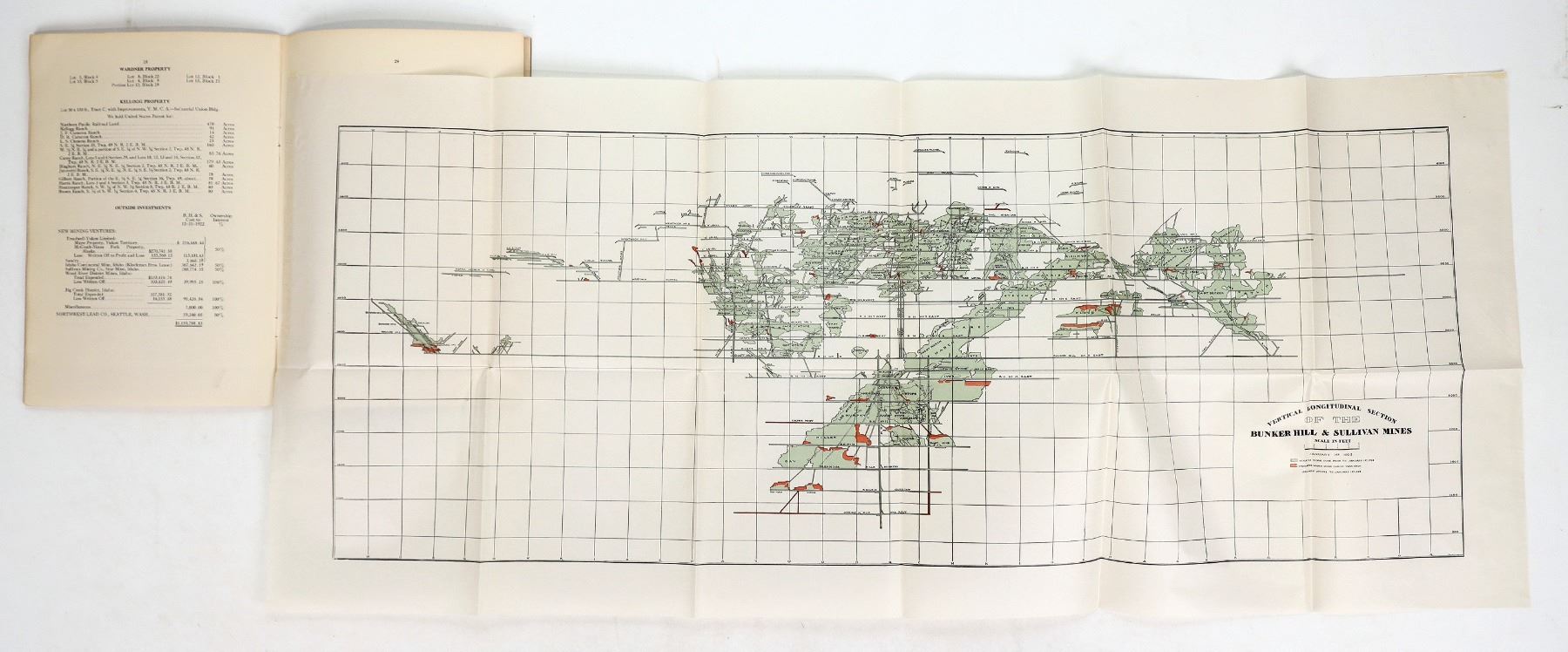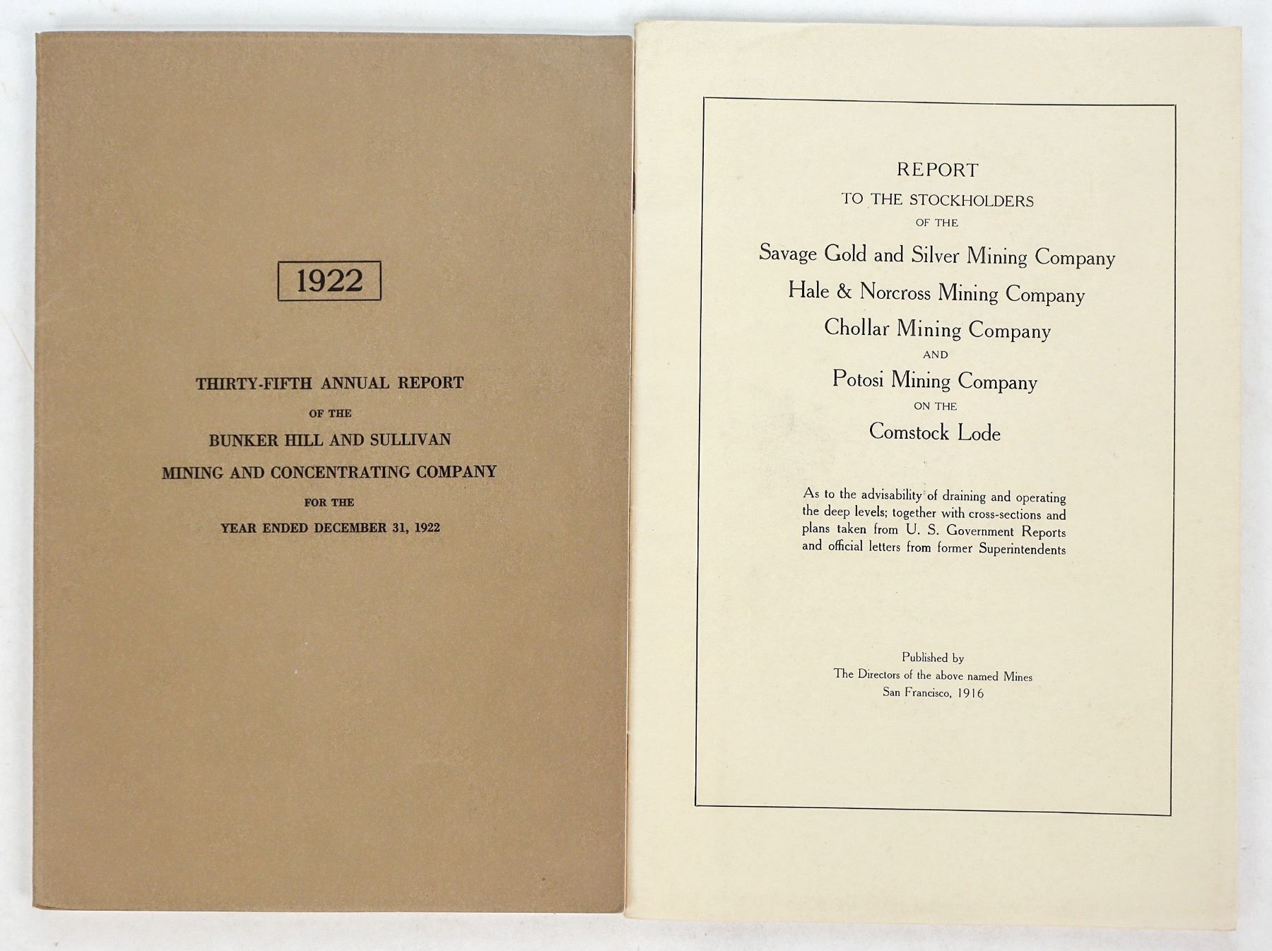 Report to stockholders of Savage hale & Norcross, Chollar and Potosi on the Comstock 1916.2 foldout maps with depths and a section of Hale & Norcross. Fine condition with just a little bit of spotting on back cover. 1922 annual report of the Bunker Hill and Sullivan Mining and Concentrating Co, with 3 colorful maps, fine condition.