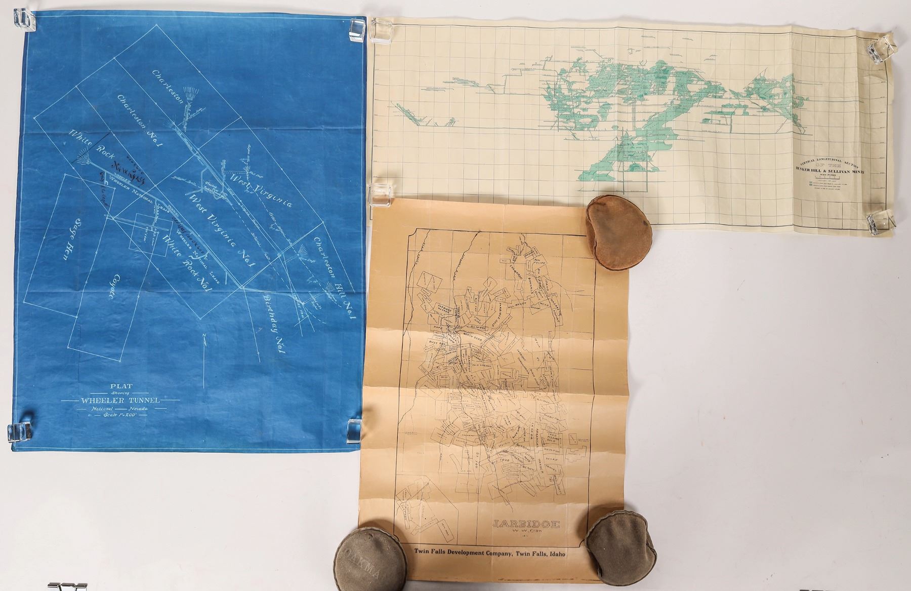 Jarbridge, Nevada, mining claims map, issued by the Twin Falls Development Co., 1911 ~ (14 ½" x 21", black on light brown paper) Wheeler Tunnel Plat, National, Nevada, 1911 ~ ( 24" x 18 ½" blueprint also shows 10 adjacent mining claims on the property) Bunker Hill & Sullivan Mine Map, Idaho 1921 ~ Shows vertical longitudinal section of the underground workings, 12" x 30" on onionskin