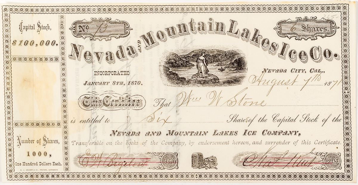 Issued August 7th, 1871 to Wm. W. Stone, 6 shares of the Nevada and Mountain Lakes Ice Company. Printed by H.S. Crocker & Co. of Sacramento. Sold by Mrs. Josephine Stone. City: Nevada City State: California Date: 1871 ID# 44511
