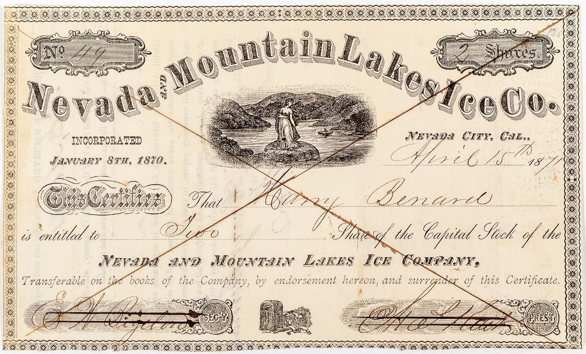 Issued April 15th, 1871 to Harry Bernard two shares of the Nevada and Mountain Lakes Ice Company. Cancelled with large "X" across the front. City: Nevada City State: California Date: 1871 ID# 44512