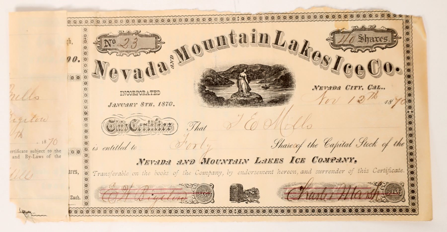 Issued 1870 Nevada and Mountain Lakes Ice stock. Issued to J E Mills. Ice from Boca, CA. Top edge issue, right stain. California Nevada City