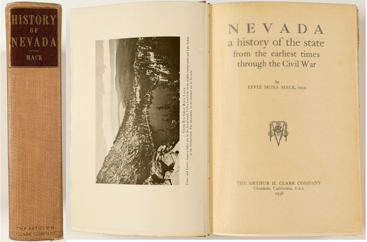 Nevada, a history of the state from the earliest times through the Civil War, by Effie Mona Mack. Published by the Arthur H. Clark Co., Glendale, CA, 1936. First edition. This is a limited printing of 250 copies. This is copy 154, signed by Effie Mona Mack. Tan buckram, gilt lettered leather spine label, top edges gilt and fore and bottom edges untrimmed, printed on rag paper, very good condition. 495 pp, illustrated. A comprehensive history of Nevada from earliest times up to the Civil War. The Indians, the Mountain Men and Explorers, Christopher "Kit" Carson, Jim Beckwourth, John Charles Fremont, the Bidwell-Bartleson Party, the Mormons, Mark Twain, The Pony Express, the Railroads, the Gold and Silver mines, notably the Comstock Lode and Virginia City, etc. Paher, "One of the best and most accurate histories of Nevada ever published, it is a valuable contribution to the history of the entire Far West. Indispensable to any Nevada collection.