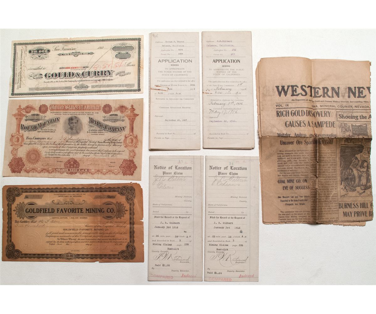 Lots include 1) three 1916 location of placer claim by J. R. Gilbert. 2) Gould & Curry 1919 stock. 3) Goldfield Favorite Mining Company 1900's stock # 123 for 500 shares signed by Fred Fontaine and J Audrey. 4) Round Mountain Mining Company 1909 stock # 2582 for 100 shares to J Hazelgrove. Signed by James Davis and H Mayer. Fancy scroll work all round and vignette is of a small child. Most unusual. 5) November 13, 1915 edition of the Western Nevada Miner newspaper out of Mina. Folded and fragile, but intact.