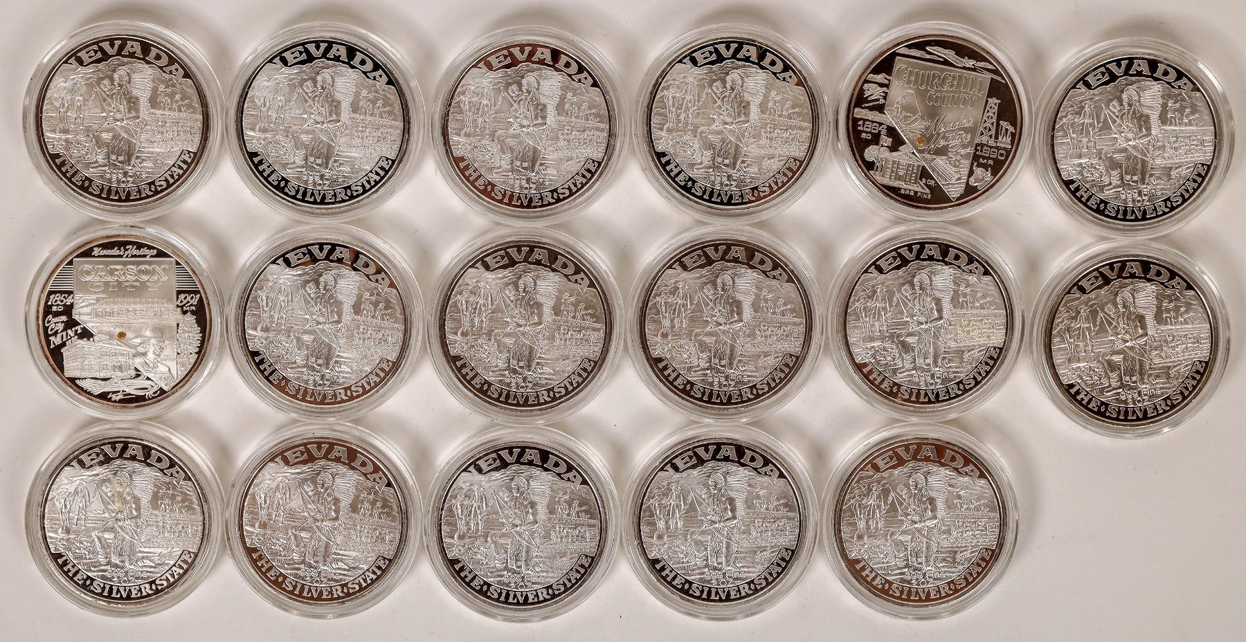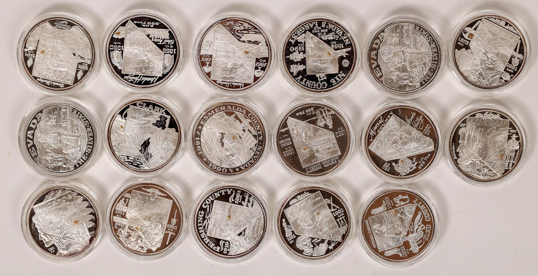 Nevada's Heritage: Lot of seventeen two ounce .999 silver medals issued in 1990 & 1991 commemorating each of Nevada's seventeen counties. A speck of gold highlights the county's location on the state map. Each in a hard plastic case, BU condition, 45 mm. Nevada