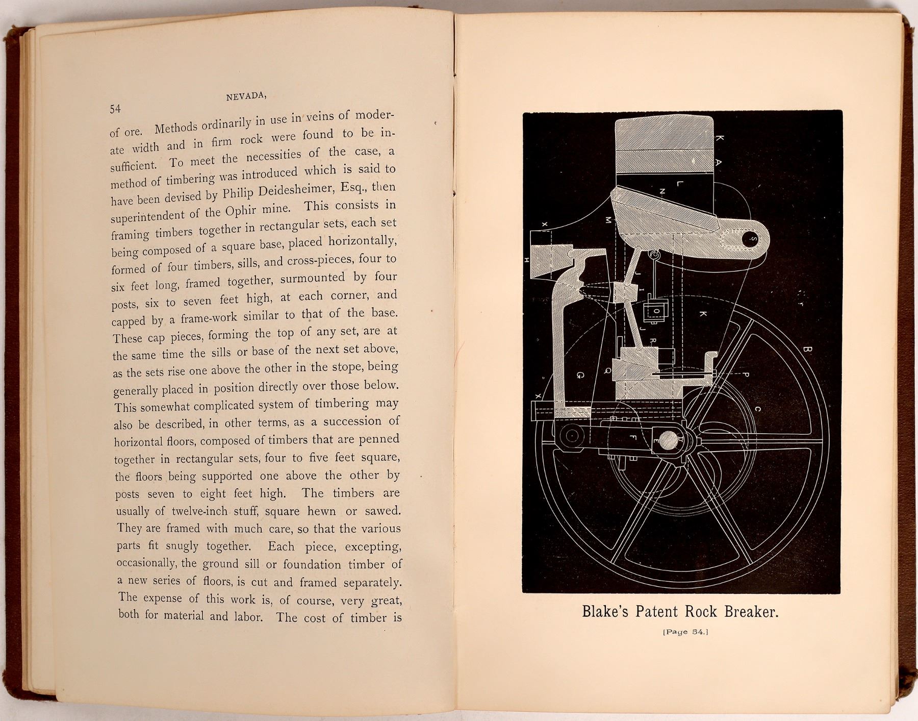 Published by Bacon & Company, Book and Job Printers, San Francisco., 305 pp, illustrated with 17 plates with 6 pgs. of advertisements at end; not indexed.. 9 x 6, Original blind-stamped brown cloth with gilt decoration and titles on front cover and spine. A study of the silver mining industry of Nevada. Features chapters and sections on: geology and natural history of the Comstock Lode; mining methods, equipment, etc.; sketches of principle silver mines of Nevada; mining and territory laws of the period; descriptions of mineral deposits; descriptions of Nevada cities, railroads, and byways; and biographical sketches of key figures in the mining industry of the time (John P. Jones and William Sharon). Contains descriptions of most of the Comstock mines, and goes on to report on mining methods, the quartz and tailing mills in Lyon, Ormsby and Storey counties, discusses prominent silver mines such as Gould & Curry, Yellow Jacket, Belcher, Caledonia and others, gives a brief account of the Sutro Tunnel and then proceeds to cover the mines of Central and Eastern Nevada. The illustrations of all the major pieces of mining equipment for the mill are reproduced from the actual detailed blueprint drawings. One of the ads is for the well-known Thomas Price Assay office in Sacramento. It also reports on the mountains, valleys, rivers, lakes etc. of Nevada, cities, railroads, flumes and water ditches and even social and educational conditions. Howes, USiana, P-526. Cowan, A Bibliography of the History of California p.180. Paher, Nevada: An Annotated Bibliography, 1577: "Powell is one of the best reference works on early Nevada mill construction." Cover is worn and faded, hinges starting but holding, otherwise the overall condition is very good. Very scarce especially in this condition.