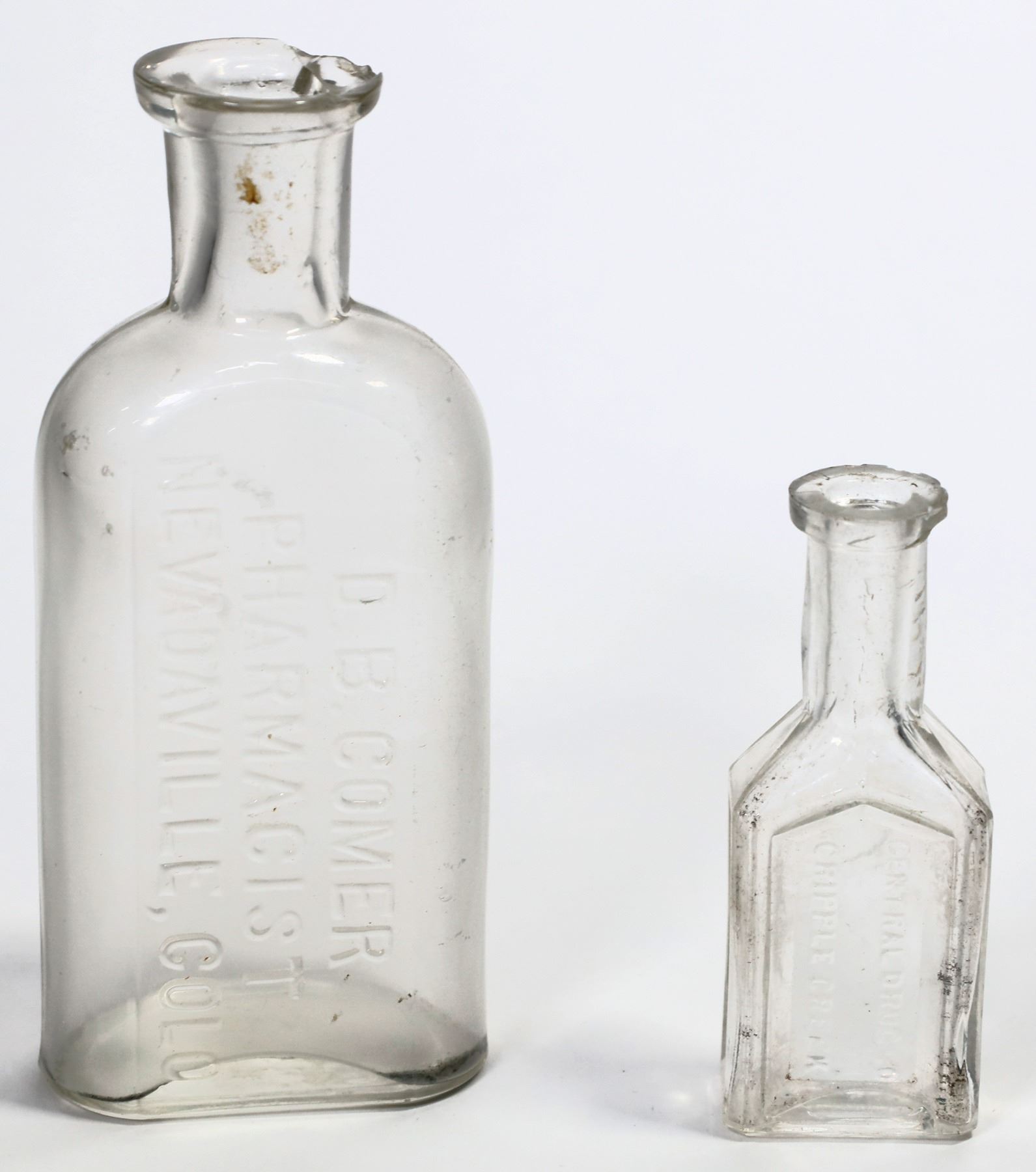 2. D. B. COMER/PHARMACIST/NEVADAVILLE, COLO. 4 3/16". A 3/4 " flake off the top of the lip. Light interior haze. Rarity - 4 per Preble.