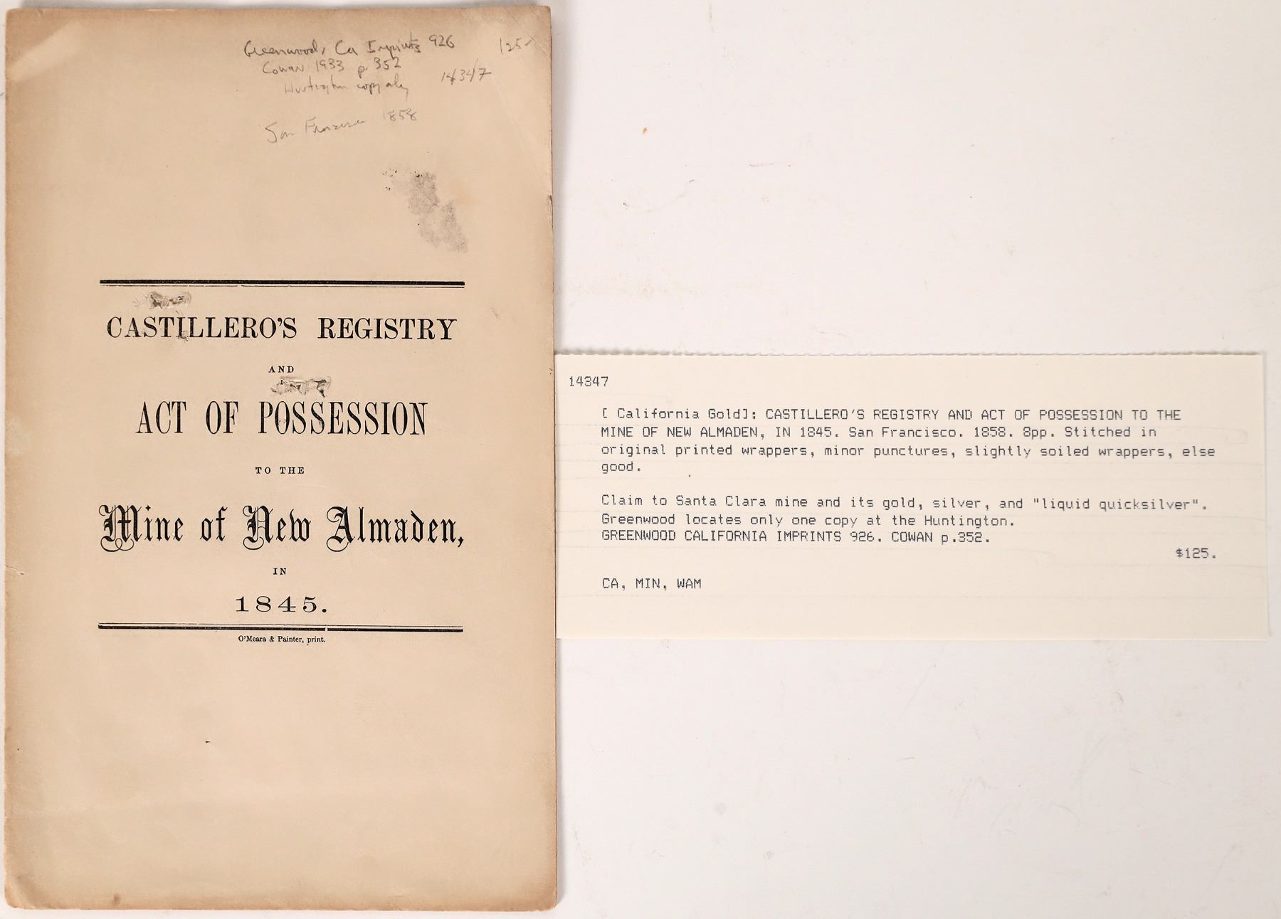 Castillero's Registry and Act of Possession to the Mine of New Almaden, in 1845. San Francisco. 1858. 8pp. Stitched in original printed wrappers, minor punctures, slightly soiled wrappers, otherwise good. This mine operated under foreign control until the Gold Rush, when serious title issues arose. The mine provided mercury to gold miners and companies to separate and collect fine gold. United States of America
