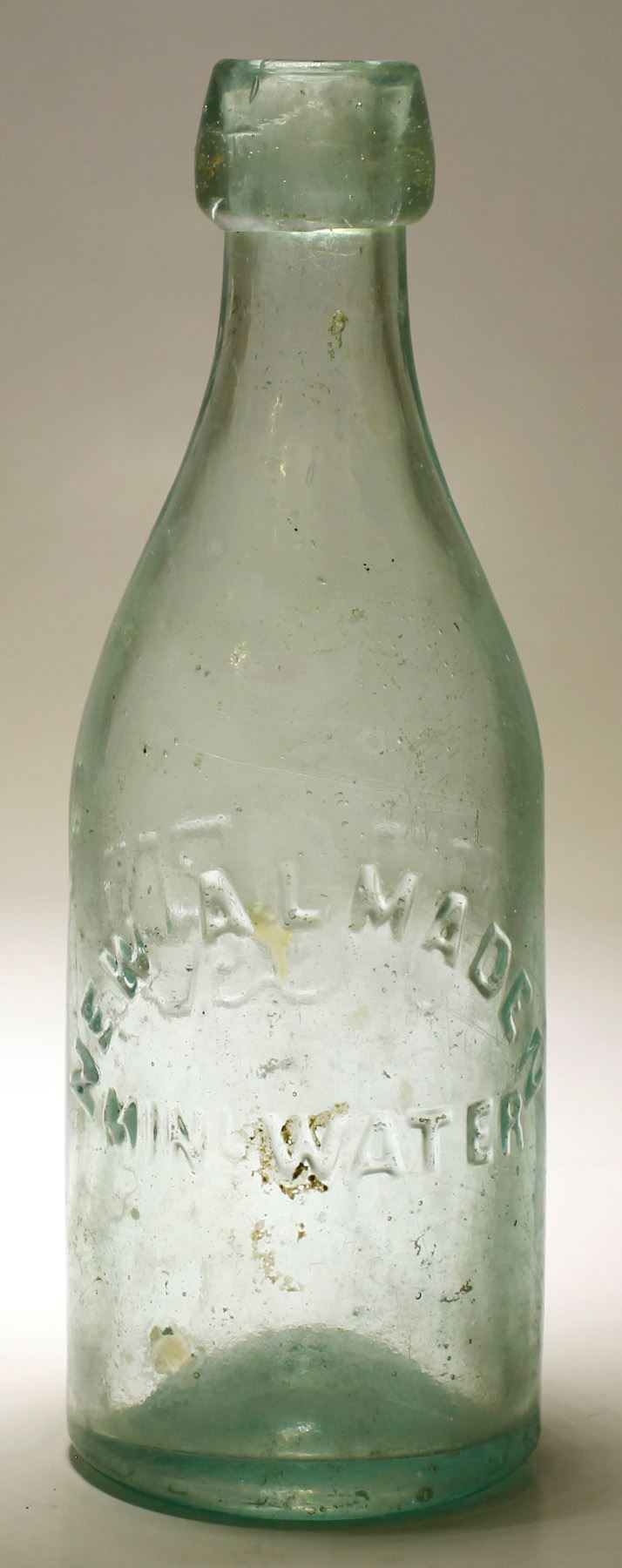 New Almaden ( au ) / Minl Water // Reverse : W & W // Pale aqua, bob top soda, applied top. 7 1/2" tall, and in dug condition. This specimen needs a bath and polishing !! Inside and ouside staining, overall But, not to bad looking. But, DEAD CENTER IN THE EMBOSSING , IS A WEIRD , DIS-COLORED, PIECE OF GLASS. It is some type of defect, looks like the bottle was blown in the mold, over the top of it, as it was left in the mold. So, it is flawed. No other type of damage. ( RH ). Date: 1860-1872 City: San Jose State: California HWAC# 77413