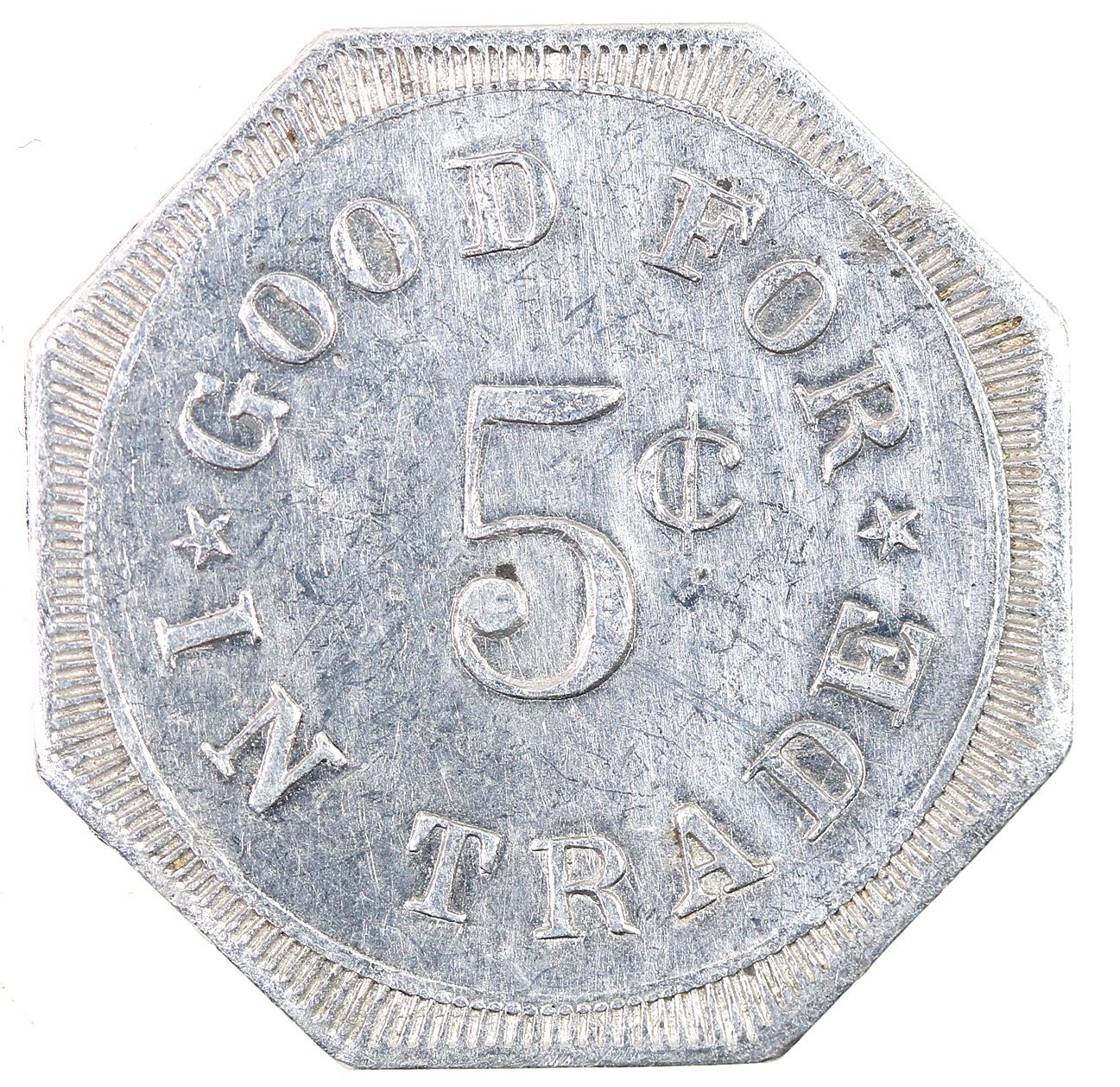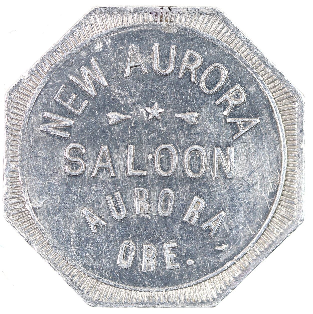 From the Marion County town of Aurora: NEW AURORA / SALOON / AURORA, / ORE. // GOOD FOR / 5¢ / IN TRADE; Al., octagonal, 26 mm, R 3. Nice AU condition![ Aurora Oregon
