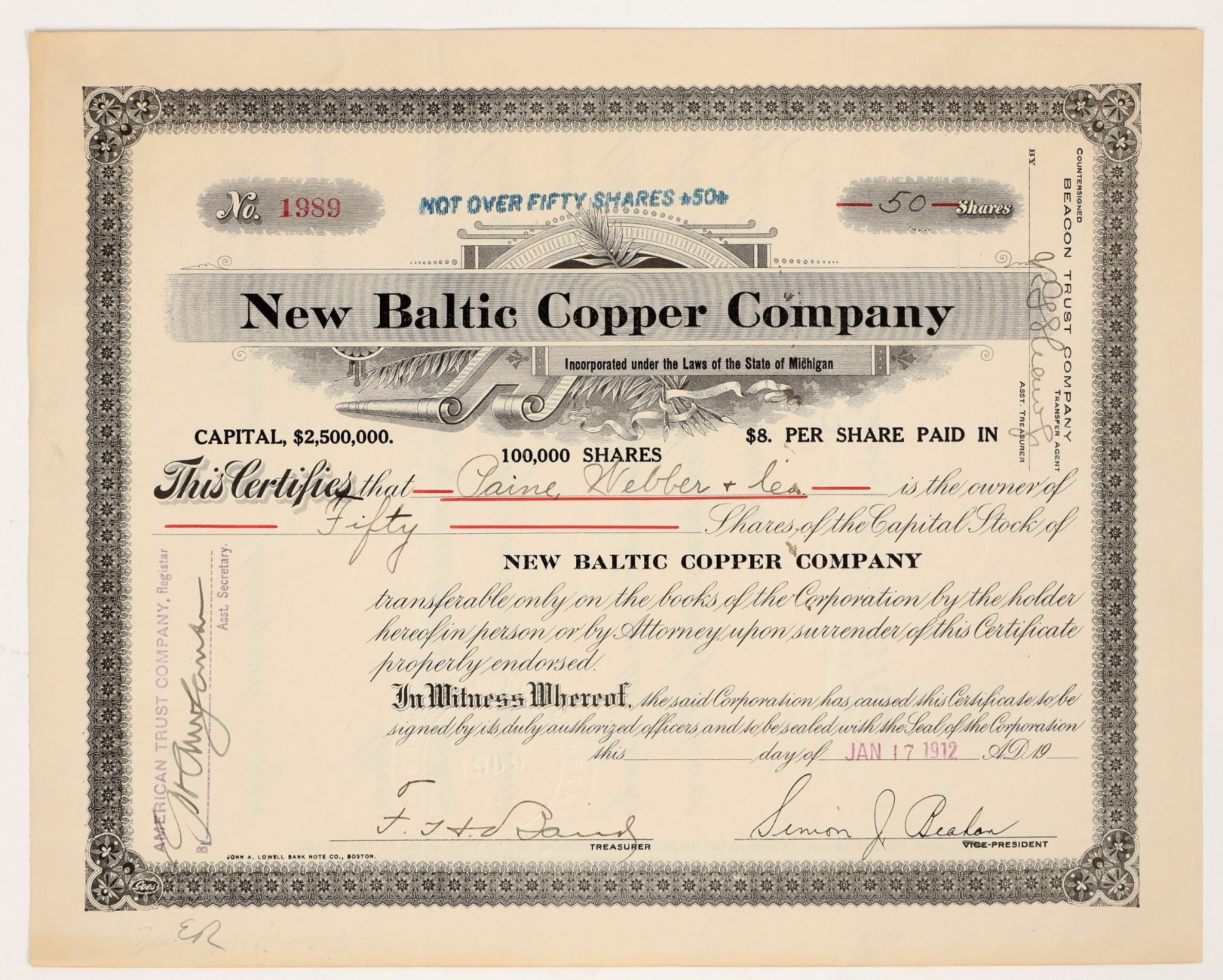 Inc. in Michigan. No. 1989, issued for 50 shares to Paine, Webber & Co. in 1912. Signed by vice president Simon J. Beahan and treasurer F. Baird. Not cancelled. 8.25 x 10.25" DeGood pg. 254, R-6. Company had 640 acres four miles NE of Hancock. Inc. 1909. Closed 1919.