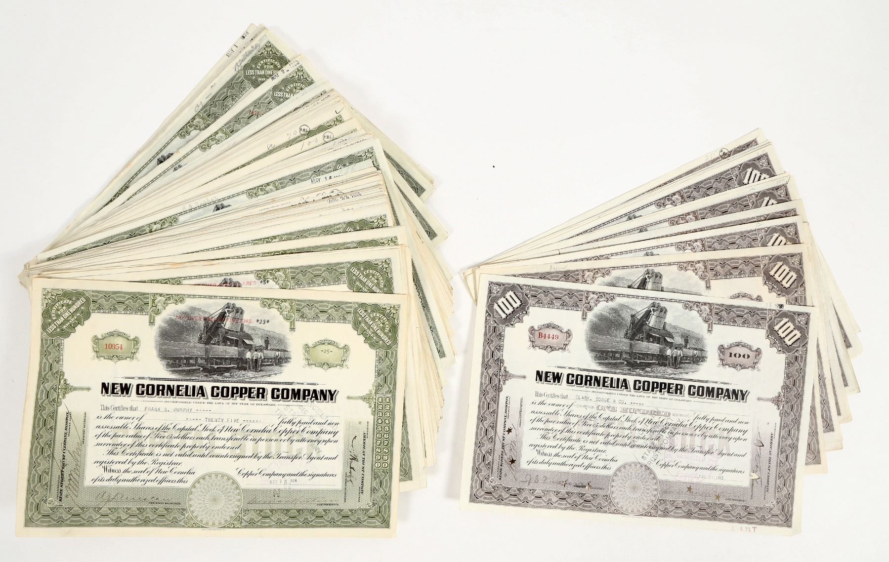 Large lot of approx. (200) certificates issued by the "New Cornelia Copper Company," incorporated under laws of the state of Delaware. An open pit mine about 125 miles west of Tucson in Pima County, operating into the early 1930's, when it merged with Phelps-Dodge. Stamp and punch cancelled, executed on the reverse, many wit revenue stamps. This group has (2) variations: the under 100 Shares group (the majority of this lot) is an olive border and seal, the 100 Shares group is a purple hue. The border and corner graphics differ between the two also. Great central vignette on both certificates of a coal train fill station loading ore carts. Overall group is very good to excellent condition. Please see photos.