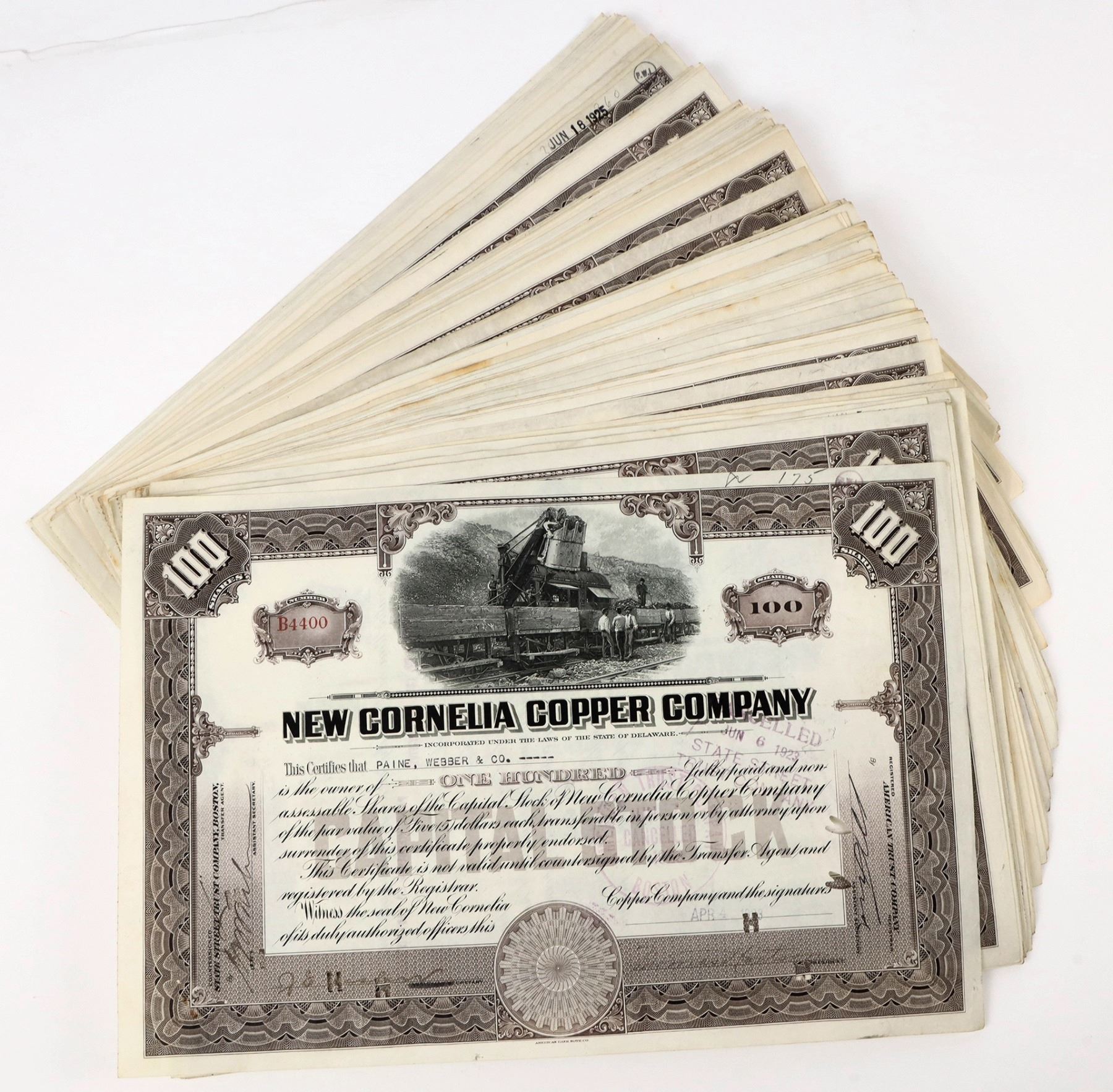 Lot of approx. (200+) stock certificates, from the "New Cornelia Copper Company." Punch cancelled, executed on reverse with signatures and stamps. Great vignette of a steam shovel loading ore cars at center. Share amounts are 100 shares each. Signed by President, Secretary, and countersigned by Trust Companies on each side. Measures 12"x8", purple hue, overall condition is very good. The New Cornelia was an open pit mine in Arizona, located in Pima County. Please see photos.