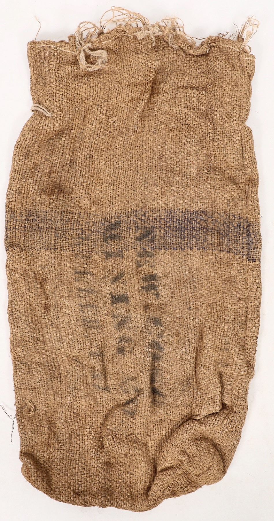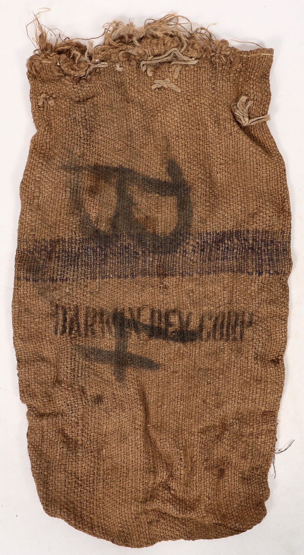 An antique ore bag from the New Coso Mining Company of Keeler, California, dating from c.1870s-1880s. The bag has a coarse weave with some noticeable wear and fraying at the mouth. It has a heavily faded horizontal blue stripe and the text "NEW COSO / MINING CO / KEELER CA" printed in black ink (heavily faded; "KEELER CA" is totally illegible). As color coding was used by some mining companies to indicate grade of ore, this blue stripe may have served a practical purpose. Reverse side has large, handwritten text reading 'B4', likely marking the origin of the contents. It also has the words "DARWIN DEV. CORP" printed in black, added after the mines' acquisition in 1915.