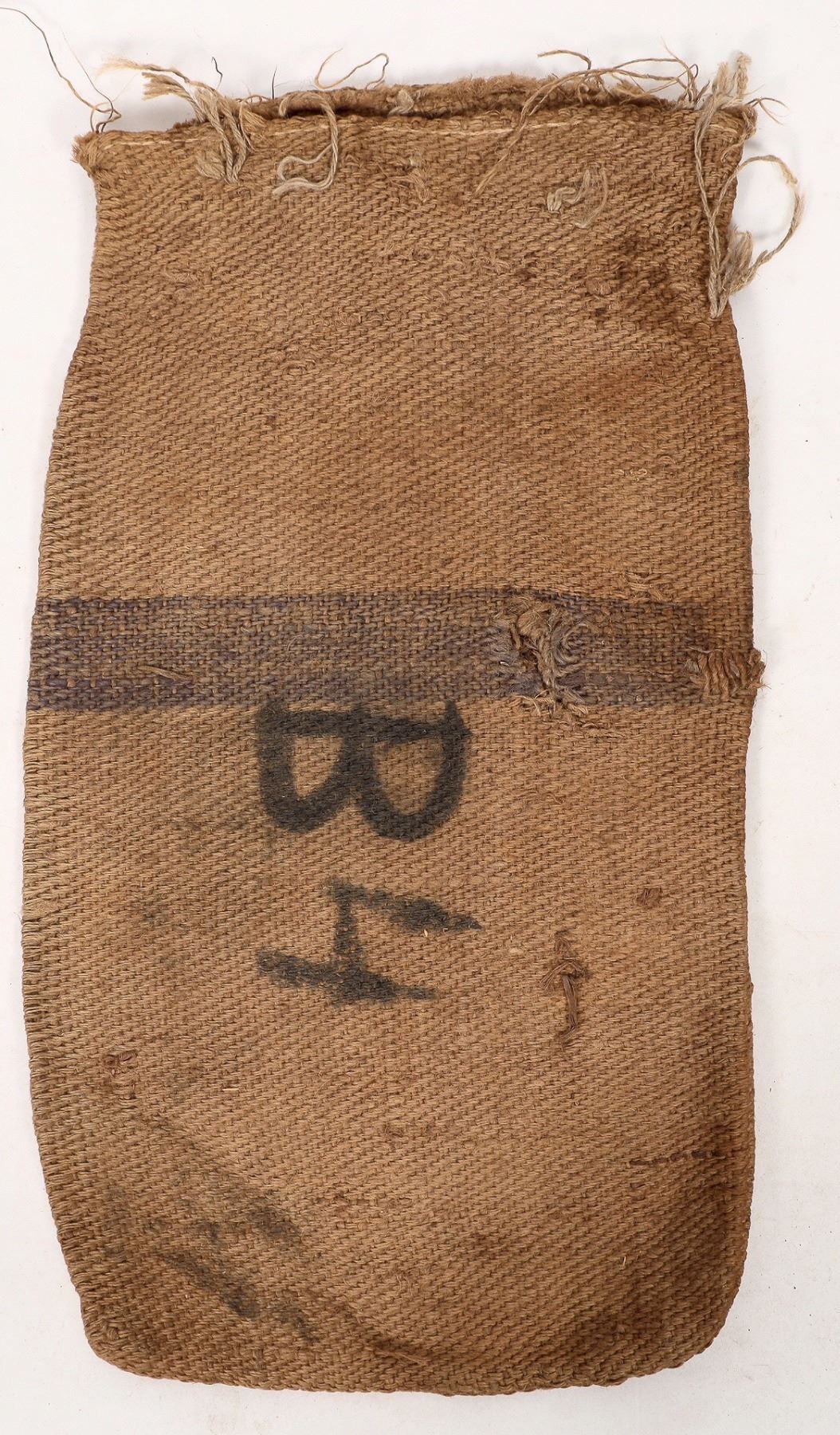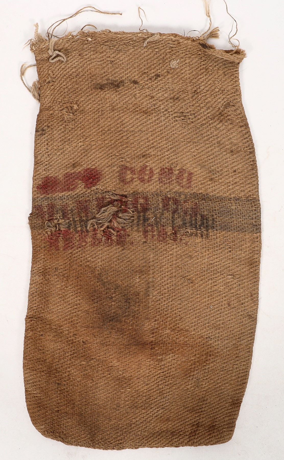 An antique ore bag from the New Coso Mining Company of Keeler, California, dating from c.1870s-1880s. The bag has a coarse weave with some noticeable wear and fraying at the mouth, as well as some spots of wear near the top. It has a heavily faded horizontal blue stripe as well as the text "NEW COSO / MINING CO / KEELER CA" printed in red ink (all words illegible except 'Coso'). As color coding was used by some mining companies to indicate grade of ore, this blue stripe may have served a practical purpose. Illegible black text, likely originally reading "DARWIN DEV. CORP." is printed over the original label. Reverse side has large, handwritten text reading 'B4', likely marking the origin of the contents.