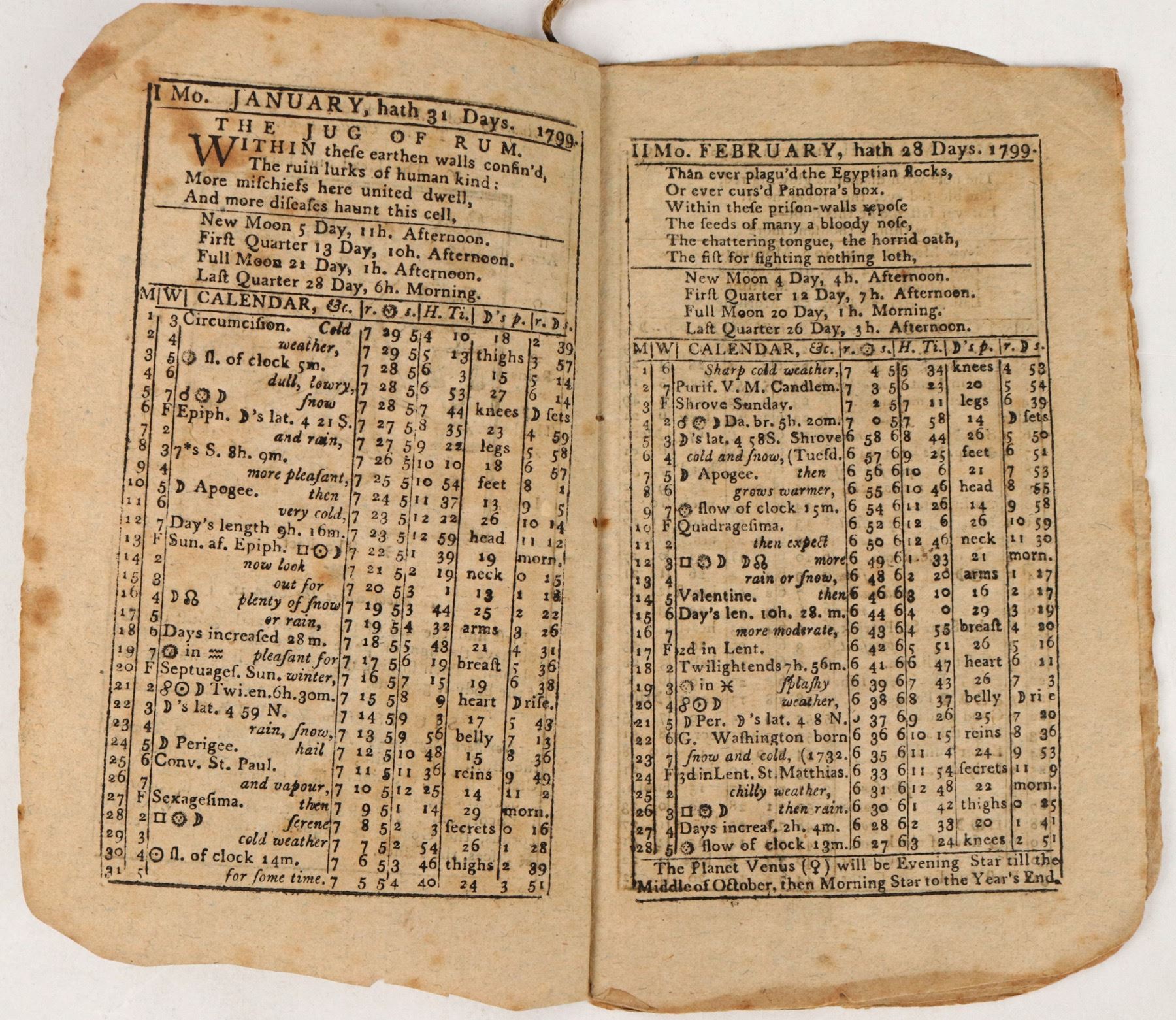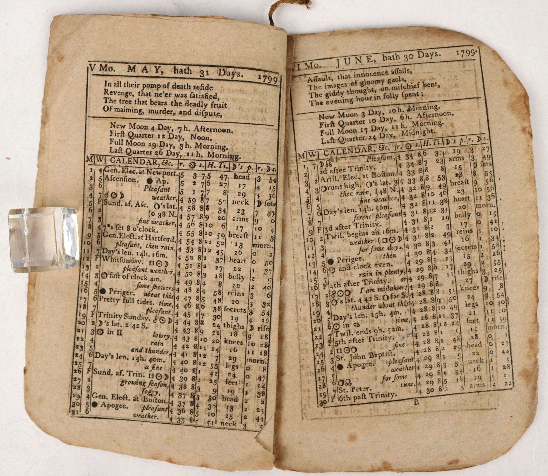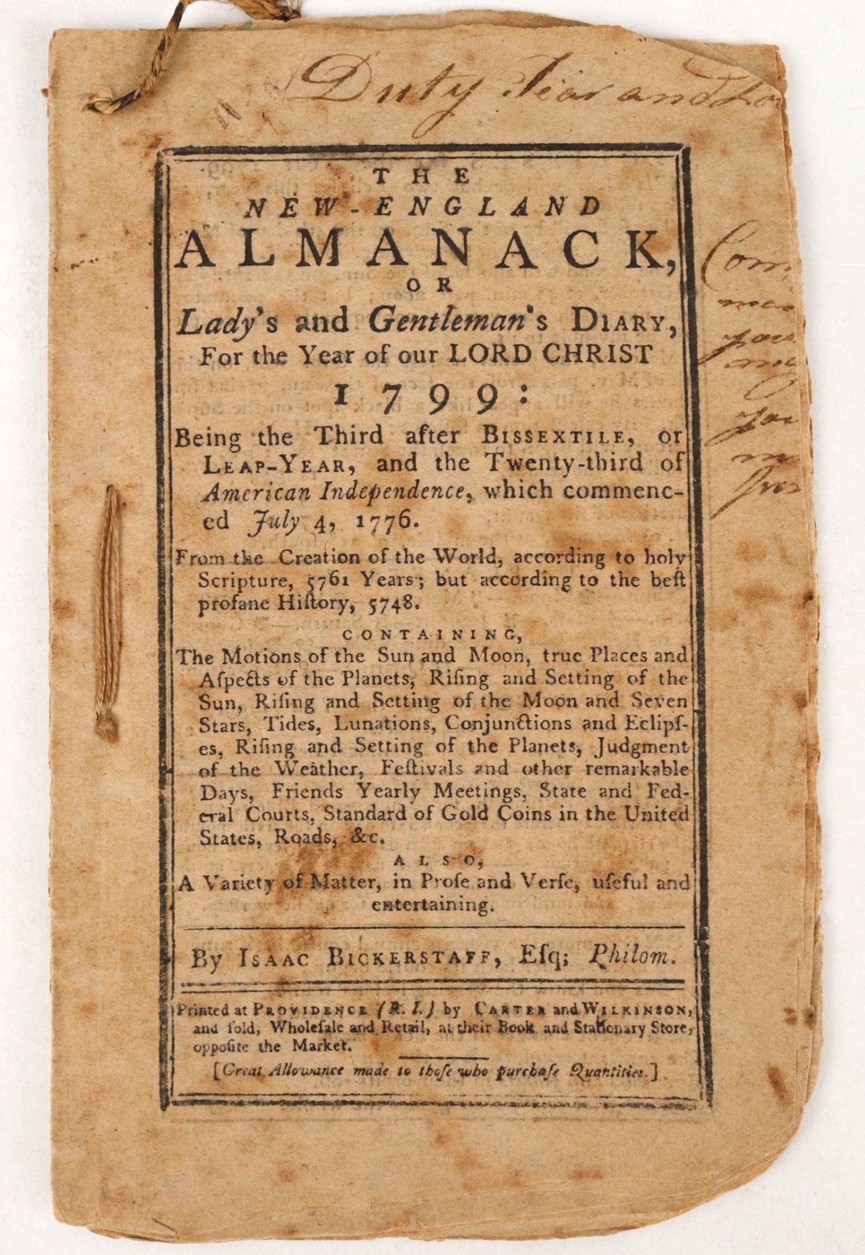 "The New-England Almanack or Lady's and Gentleman's Diary, For the Year of our Lord Christ 1799..." by Isaac Bickerstaff. Printed at Providence, Rhode Island by Carter & Wilkinson. String bound. 21pp. Heavy foxing. 7 x 5"