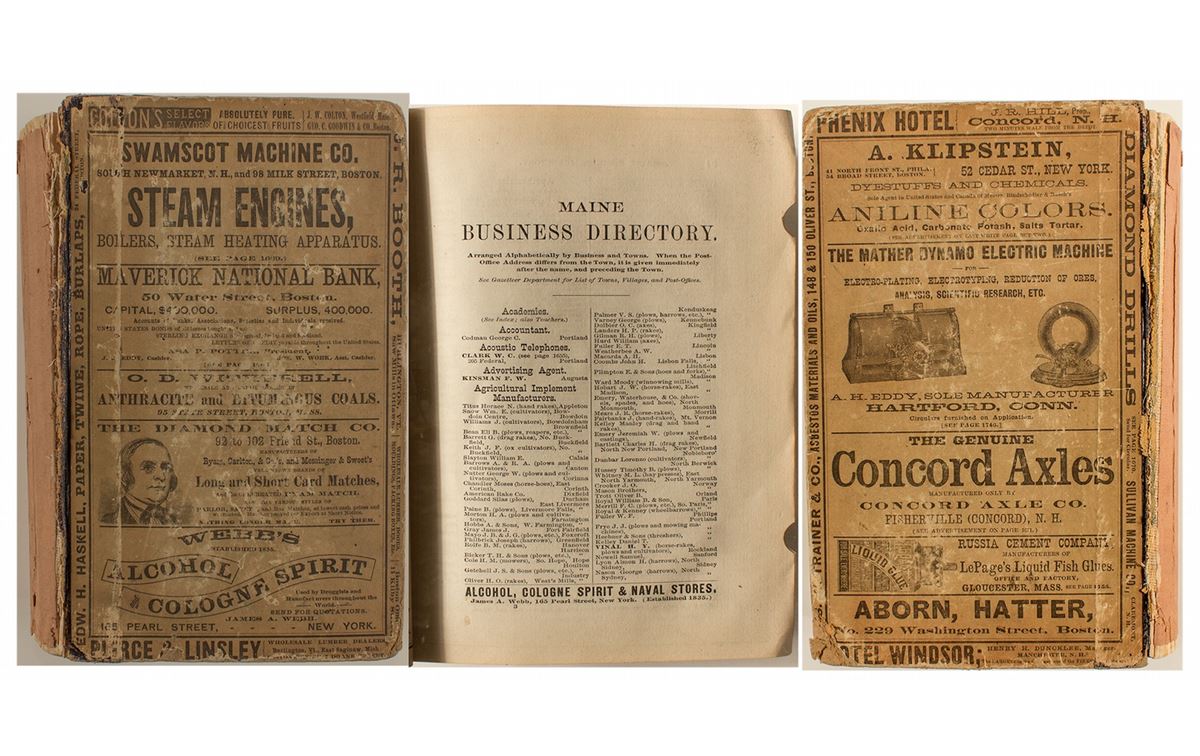 Published by Sampson, Davenport, & Co., publishers of the Boston directory, Boston almanac and business directory, New-England business directory, etc. Office, 155 Franklin Street, Boston. This biennial volume has advertisements on front and back covers and at various places in the directory. Table of contents is extensive and lists occupations as well as states. There is also a five page index to individual advertisements. Front cover not connected and spine cover is missing. Back cover connected and all pages still attached to spine. Was the property of the Boston-Library Society and released by the Boston Athenaeum. 1,856 pages. [rarity: i]