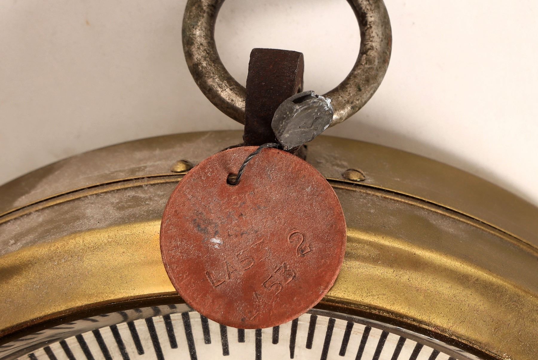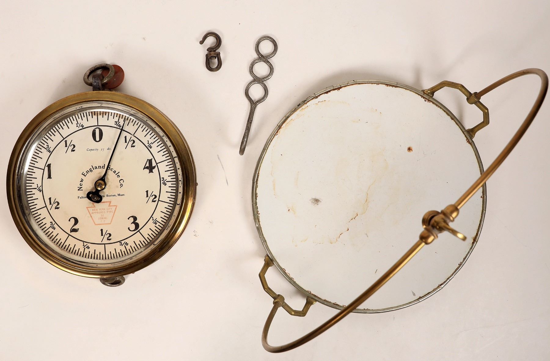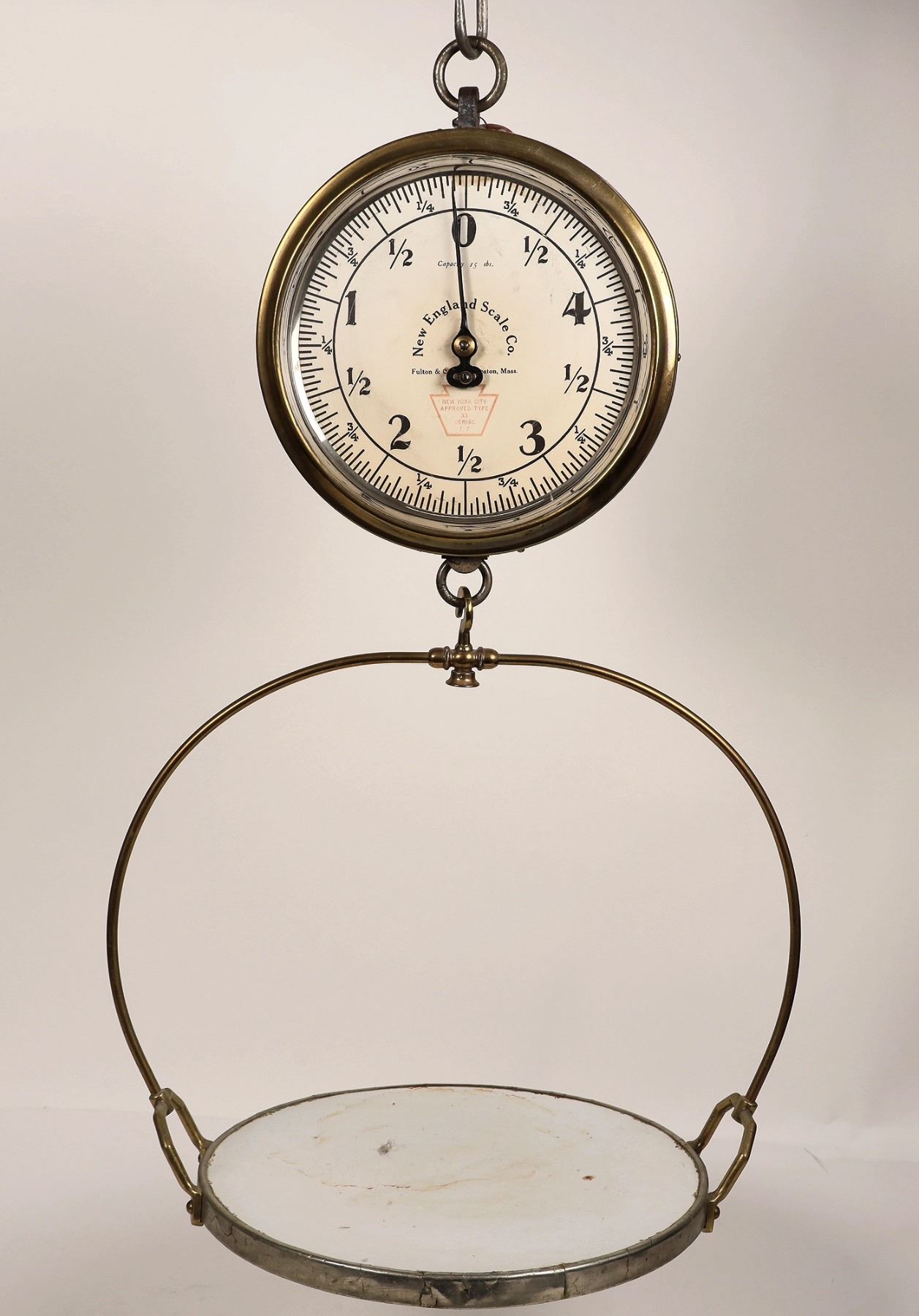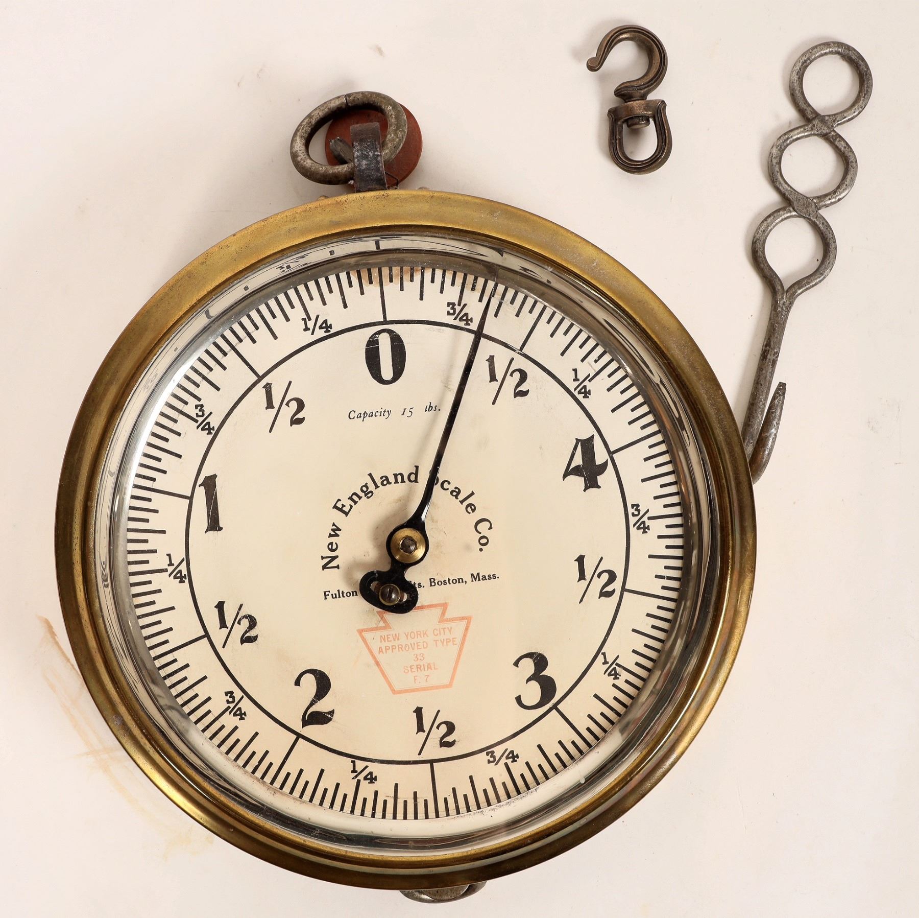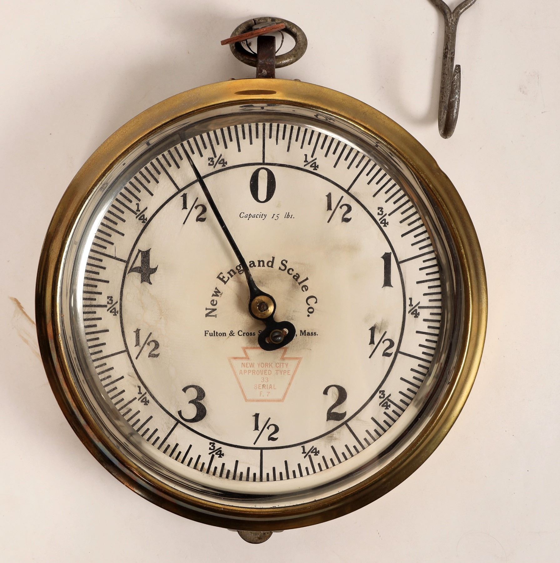New England Scale Company 15lb. capacity market hanging scale. Scale face is brass and measures 10". Weighing pan measures 13". With hanging hoop and scale, the piece is about 26" total in height and 18" wide. It still works and is an attractive kitchen decoration. Please see photos for more details.