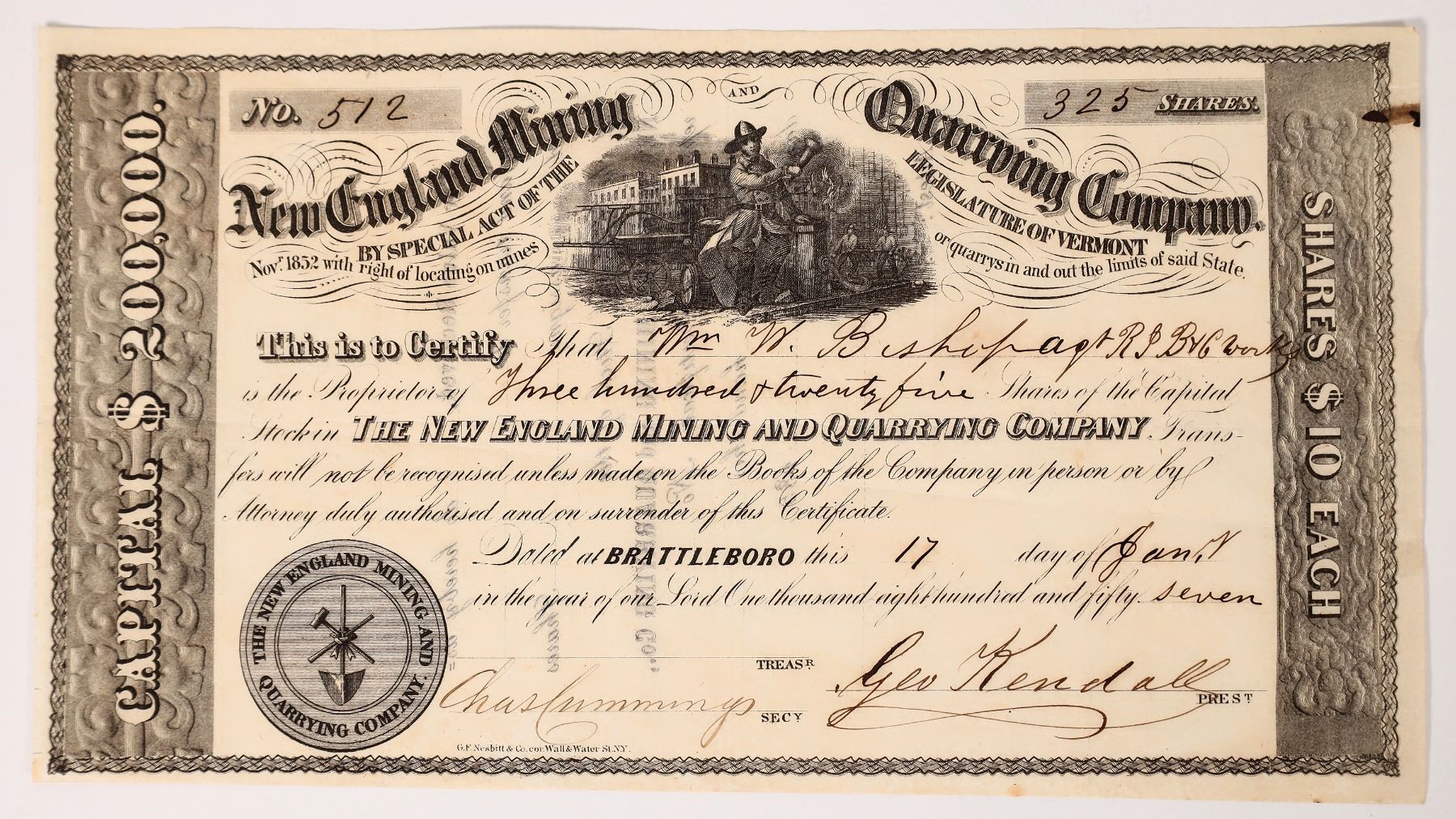 Issued 1857 New England Mining and Quarrying stock. #512, 325 shares. This region was known for limestone and granite mining. Interesting firemen vignette. Vermont Herzog Collection