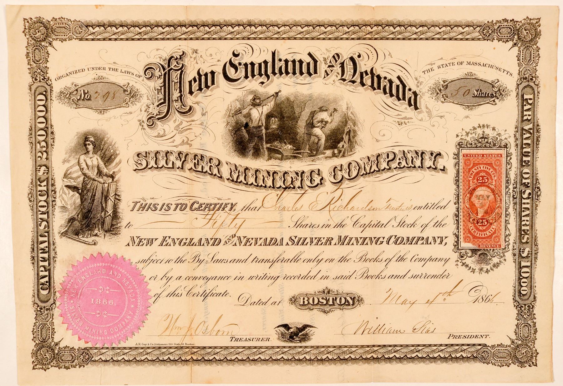 Not seen before. Organized with the secret intention of raising money to build a church in Austin, Nevada! Inc. in Massachusetts. No. 298, issued for 50 shares to Charles E. Richardson on May 4th, 1866 in Boston. Signed by president William Sias and treasurer William J. Osborn. Not cancelled. Ornate black border and print, pink corp. seal. Two vignettes: allegorical woman (left) and miners (top center). Printed by A.R. Gay & Co., Boston. One 25 cent adhesive revenue stamp attached on the right side, stamp cancelled. 7.5 x 10.75" Deep folds with 1.5" separation along one fold. Other light wear. The main reference to this company we could find mention that one of its principal backers was Austin religious figure J.L. Trefren. Trefen organized the company to raise money to build the Austin Methodist Church (built in 1866)! The church was built and a fine organ was purchased (possibly the first church organ in Nevada) before the scheme collapsed. It appears the company dissolved in 1872. No production information located. [The Works of Hubert Howe Bancroft: History of Nevada, Colorado, and Wyoming. 1890, pg.295] () Ken Prag Collection