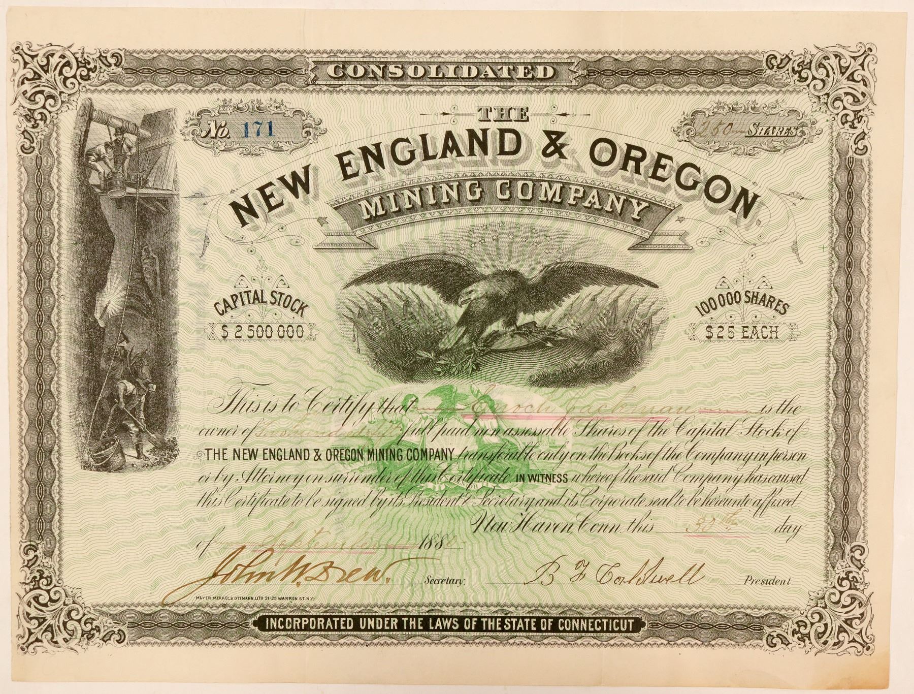 Cert. #171, issued for 250 shares in 1880 to Enoch Jackson. Signed by B.F. Caldwell as president and John N. Drew as secretary. Eagle with shield in the center and miners raising ore with buckets at the left. Black print on green tinted paper. Burchard, in 1881, noted that this company was doing well at Page Valley in Baker County. In 1881, about $250,000 of gold was produced in the county. This certificate is in VF condition and is uncancelled. Oregon mining stocks from the 1880's are quite rare.