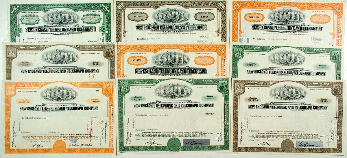 Lot of 9: New England Telephone & Telegraph Company, which was originally established in 1883. There have been multiple mergers and acquisitions over the years. These certificates are in excellent condition, and feature a great central vignette of multiple shield array, with a original wall-type telephone above in the rear. Unusual group. (Prag Collection) City: Boston State: Massachusetts Date: 1955-1962 hwac# 28936