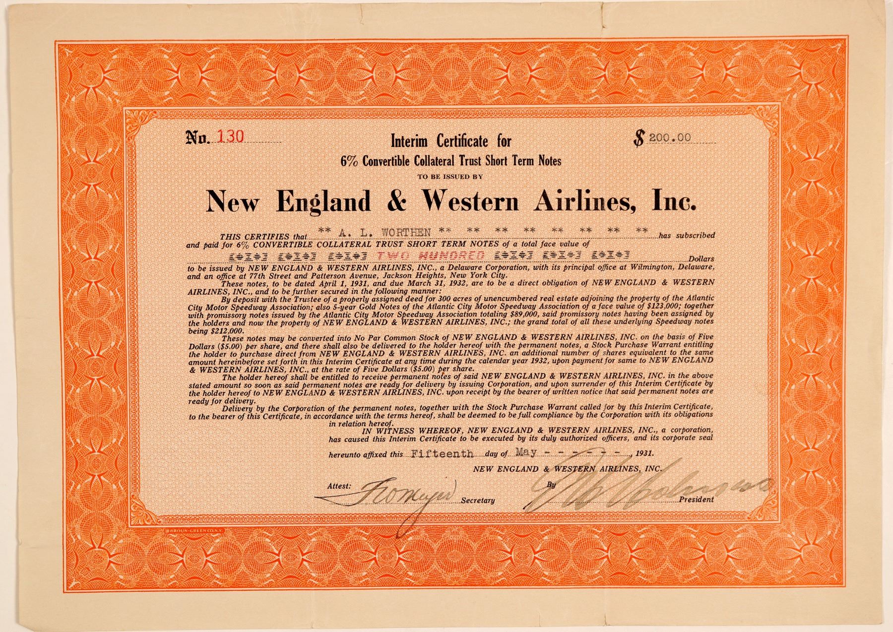 Interim Certificate for 6% Convertible Collateral Trust Short Term Notes. No. 130, issued for $200 to A.L. Worthen on May 15th, 1931. Signed by president Holmes and secretary Meyer. Not cancelled. Orange border and background, black print. 8.75 x 12" Heavy folds with some separation. Successor to New England & Western Air Transportation Company. Headquarters in Springfield. Also owned the Grand Central Air Terminal, Inc., formerly known as Holmes Airport, located in Queens and put out of business with the construction of LaGuardia. Ken Prag Collection