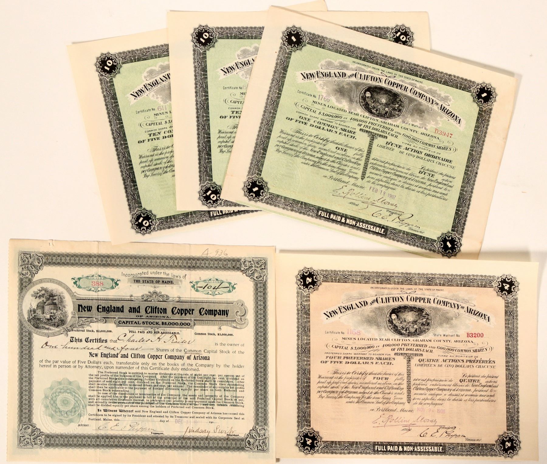 Lot of 5. Stocks in English and French. One for 1 share, One for 4 shares. Two for 10 Shares. Signed by E Rollins Morsy and CE Pippin(?). All coupons are attached. In near perfect condition. The Clifton and New England mining companies merged and created this new company. The New England company owned the Copper King. The mine was northwest of Clifton about 5 miles and the opposite side of the San Francisco River. They had two shafts: 350' and 335'. The French text is explained by its many French investors.