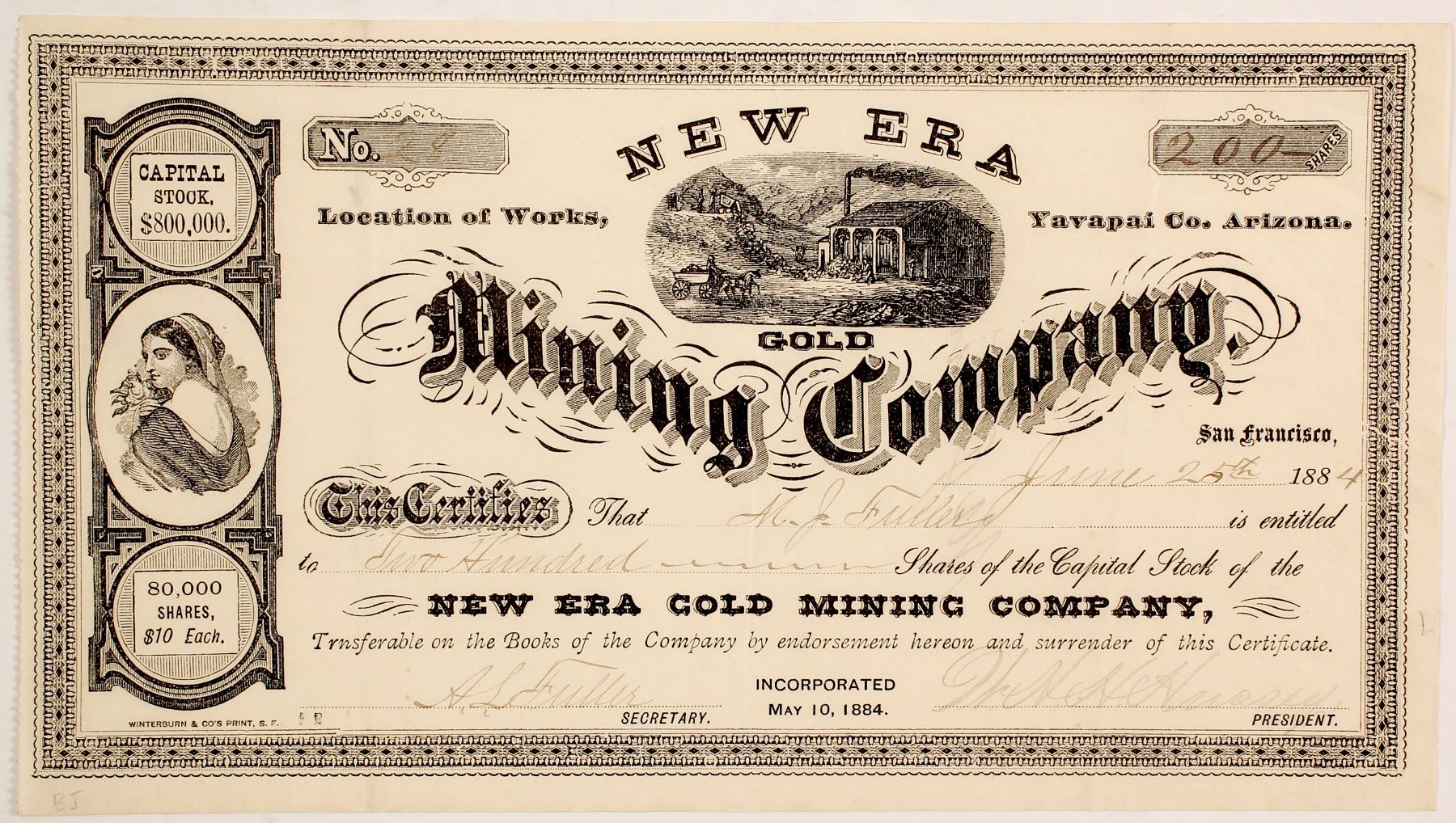 Inc. in South Dakota. No. 28, issued for 200 shares to MJ Fuller on June 25, 1884. Signed by the president, Hussey, and secretary, AL Fuller. Dateline 1884 San Francisco. Incorporated May 10, 1864. Not cancelled. Mill and mining vignette. MJ Fuller would sue the company in 1886. That is the last time the company appears at newspapers.com. Ken Prag Collection