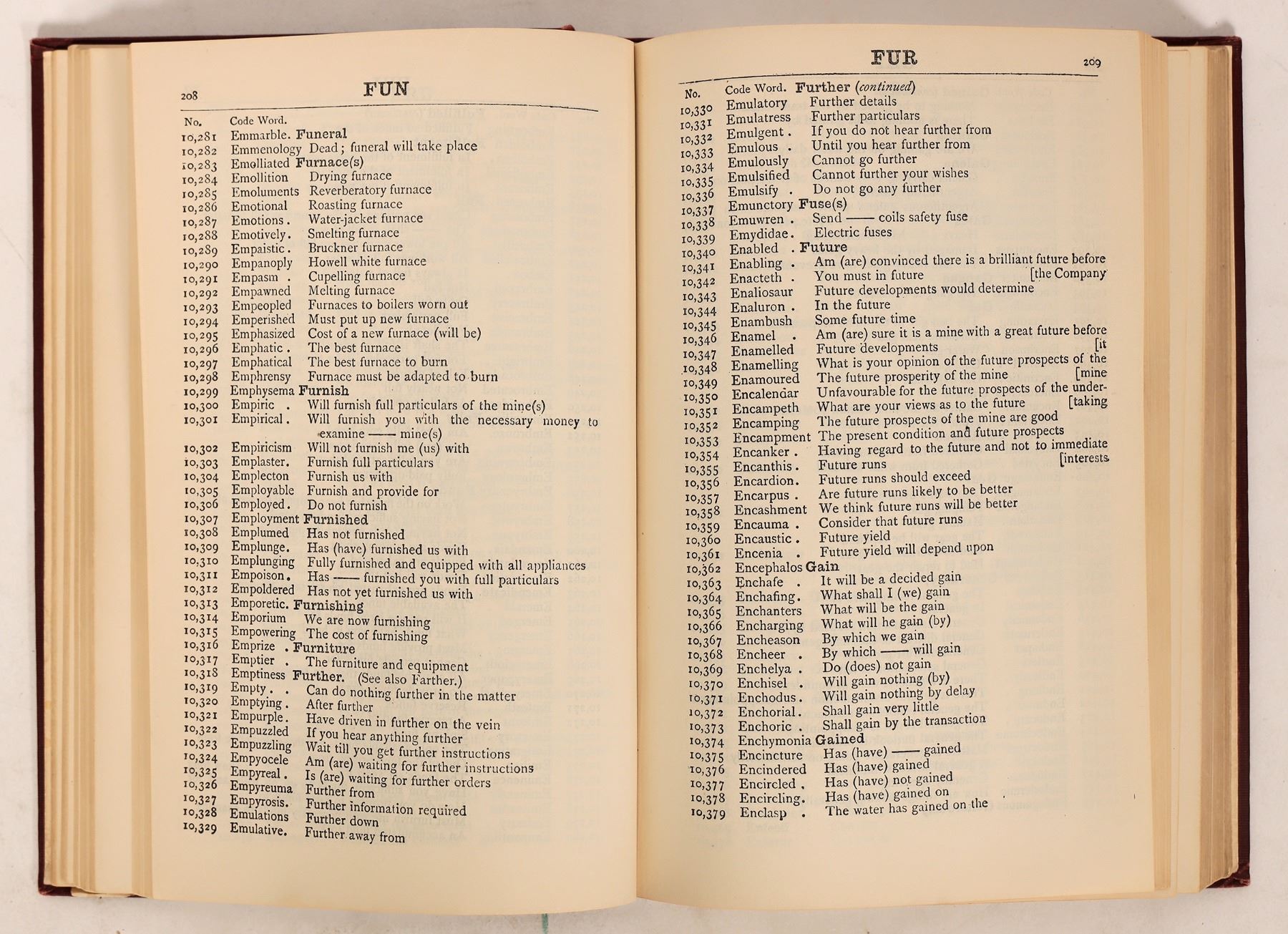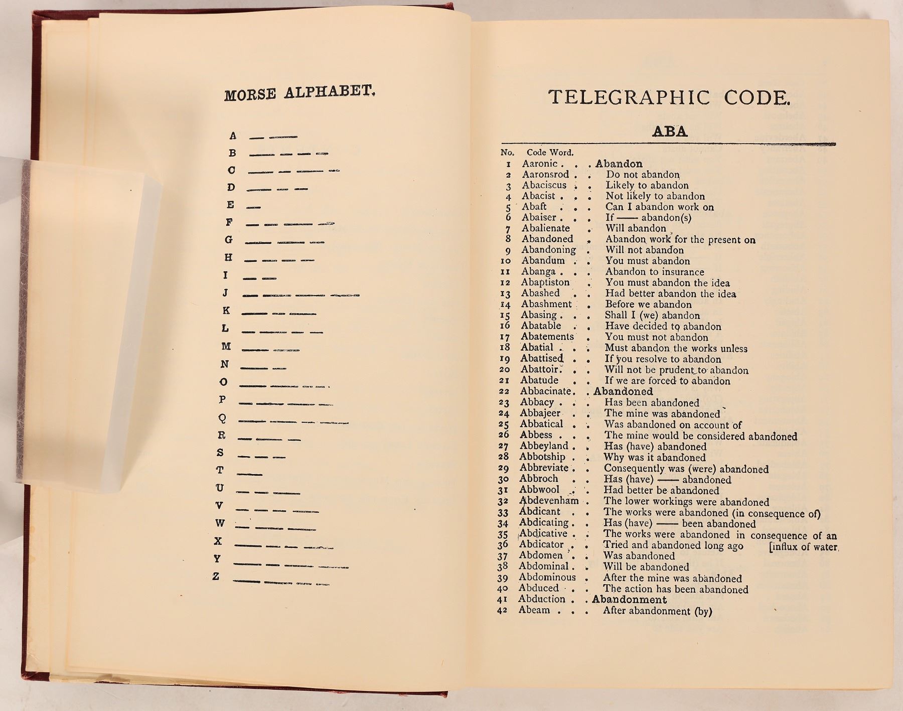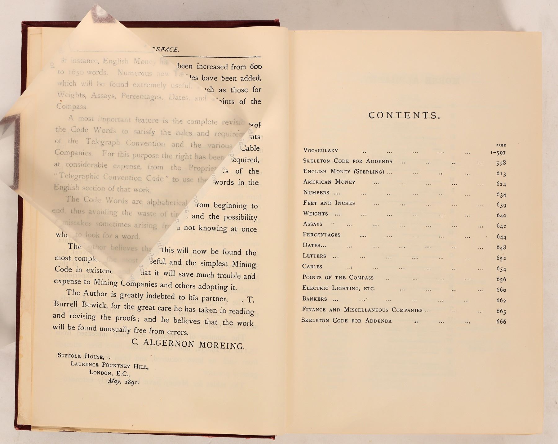 Essay on "The New General and Mining Telegraph Code" by C. Algernon Moreing and Thomas Neal, "for use of the mining companies, mining engineers, stockbrokers, financial agents, and trust and finance companies. Light bump damage, fly page torn out. Overall good condition. 676 pages total. 8.5x6 inches.