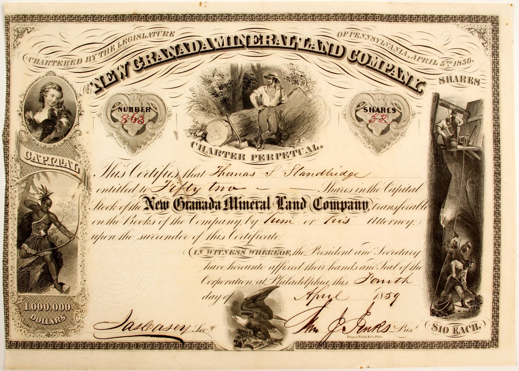 # 863 for 52 shares to Thomas S Standbridge. Signed by James Casey and president Jenks. Dateline Philadelphia 1859. Chartered April 5, 1856 in Pennsylvania. Five vignettes: mining, eagle, Native American shooting bow, lady, and lumberjack. Praper Welsh & Company printers. Not cancelled. Tear bottom right. Cut close on left. Very nice. A Pennsylvania Company hoping to exploit gold on the Isthmus of Panama (New Granada). The company did not seem to last long. Ken Prag Collection