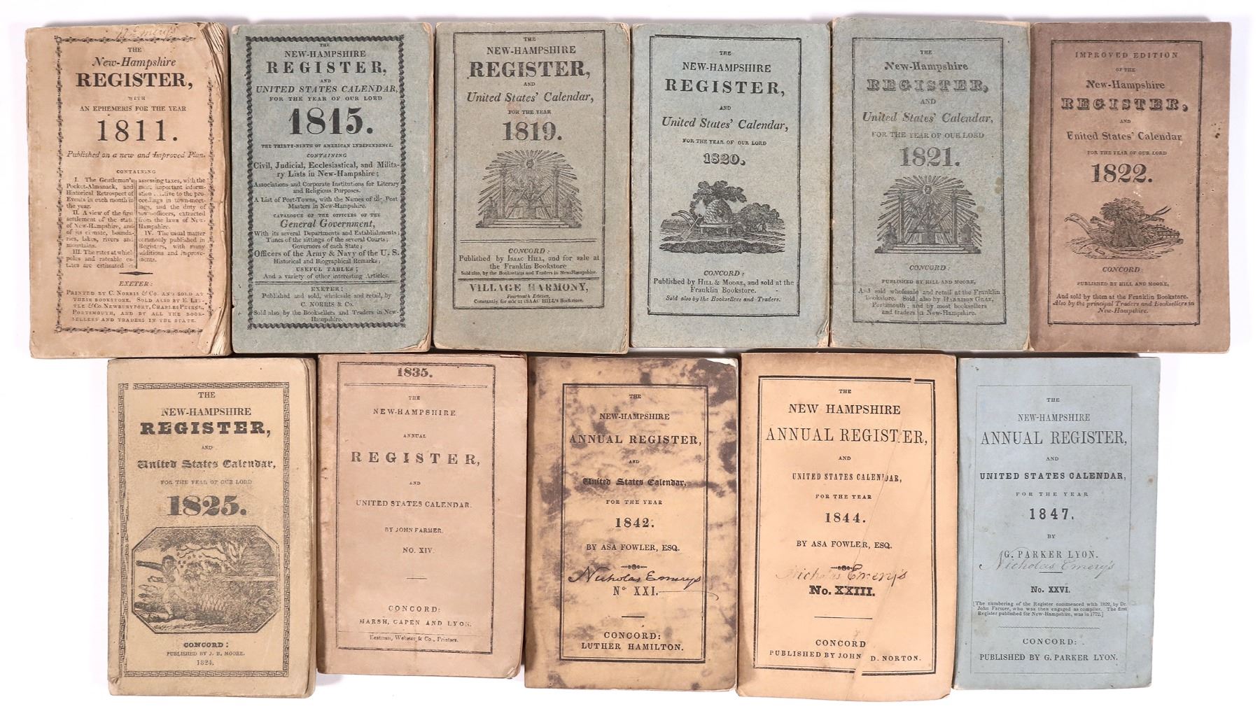 11 volumes of New Hampshire Annual Register. 1811-missing cover, 1815-spine damage, 1819, 1920-spine damage, 1821-spine damage, 1822-spine damage, 1825, 1835, 1842, 1844, 1847._x000D_