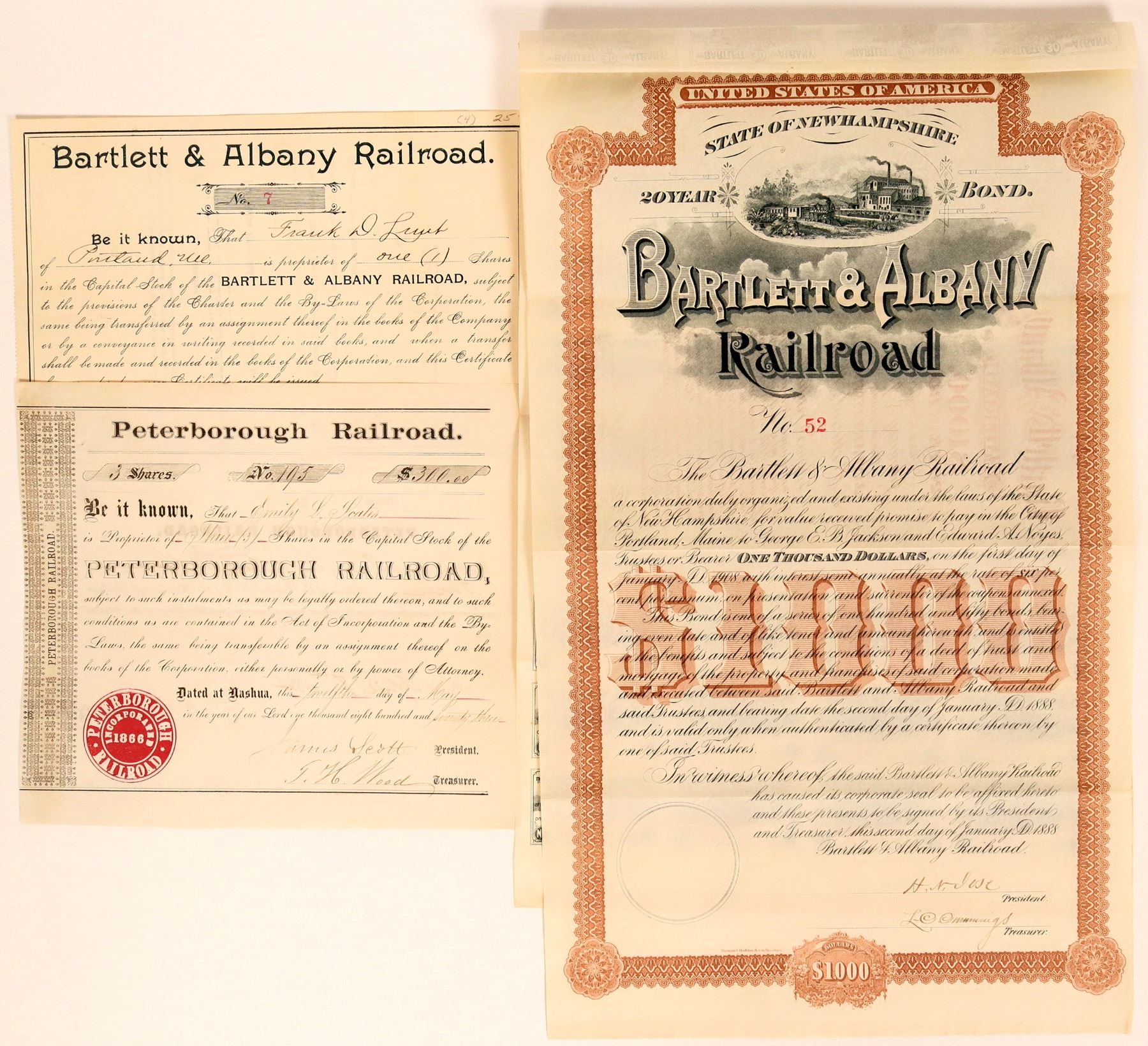 1. Peterborough Railroad Stock- I/U #195 Emily Yates 3 shares 1873 signed by President Scott. 2. Bartlett & Albany Railroad Stock and Bond Certificates- Two from Bartlett & Albany. Common cert. #7, issued in 1893 for 1 share. No vignette. Bond cert. #52, issued in 1888. Train near factory, forty coupons, $1,000, 6%, 20-yr, 1888, due 1908, by Hobbs. Both I/U and VF.