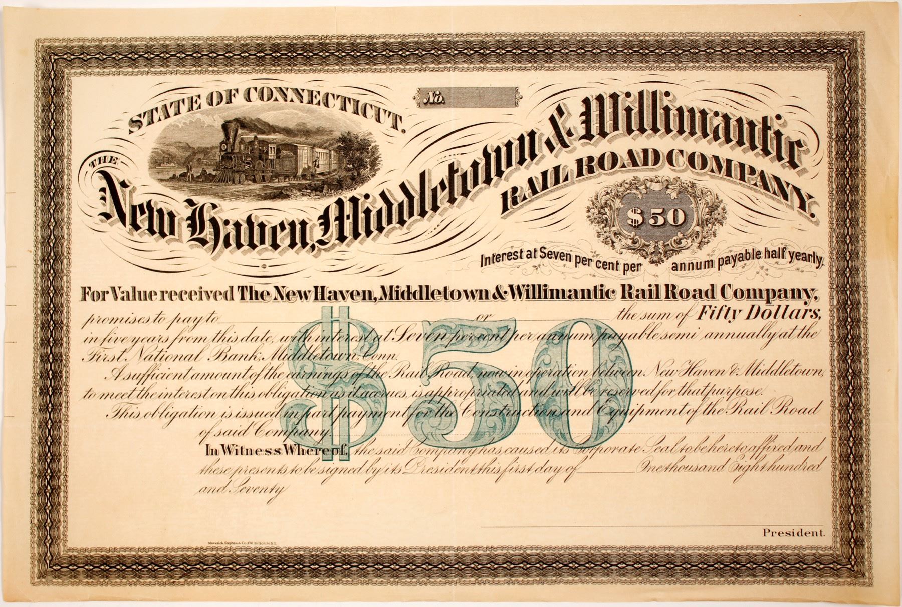 Unissued New Haven, Middletown and Willimantic $50 loan with 7% interest after 5 years; datelined 1870; printed by Maverick Stephen and Co.; good condition, crease down the middle and bend edges; Ken Prag Collection. City: State: Date: 1800's HWAC# 78708