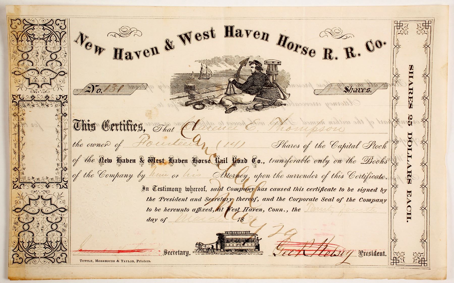 Incorporated 1805 State of Connecticut. I/C # 131 for 14 shares @ $25 par, issued March 24, 1886, signed Geo. Kelsey president, black, horse drawn street car vignette on bottom, sailor sitting on pier on top, embossed seal, Tuttle, Morrhouse & Taylor printer.Cancelled handwritten. EF+ Ken Prag Collection