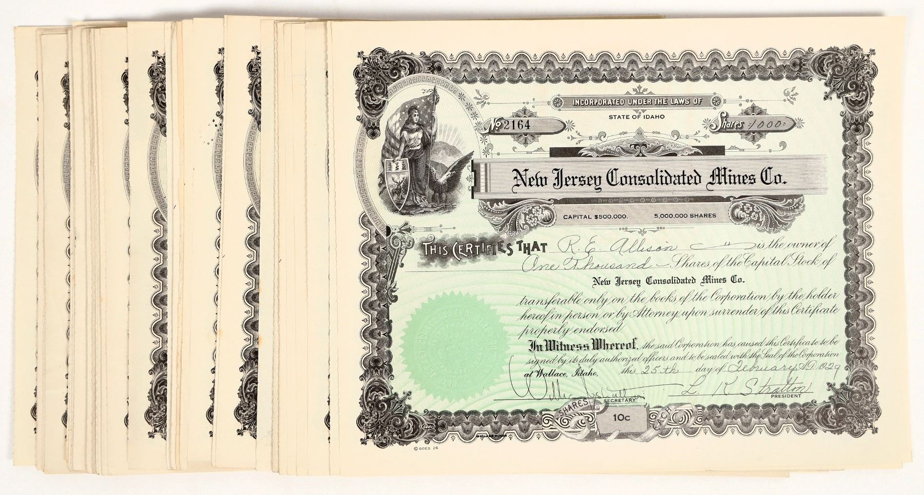 Approx. 70. I/U, I/C. Issued 1928-29 VG or better. New Jersey Consolidated Mines Co., some have revenue stamps. "CANCELED" hole punched. Goes printer.