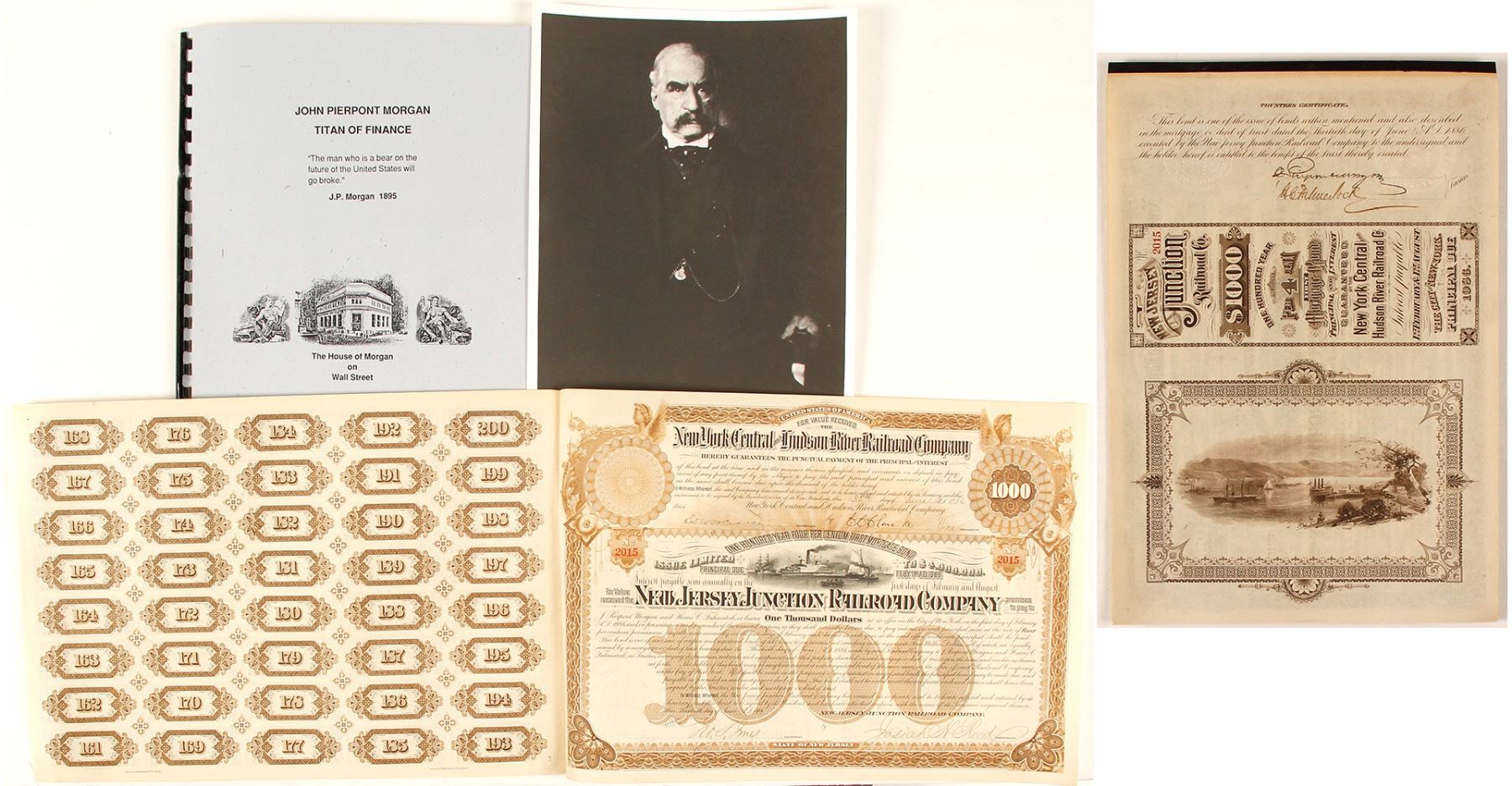 Very rare autograph piece! $1,000 bond No. 2015 issued June 30th, 1886. Signed by the president, vice-president and secretary on the front. Signed by J.P. Morgan and Harris C. Fahnestock as trustees on the reverse. Vignette of ships in harbor on front. Large vignette of ships and locomotive on reverse. Brown border. Printed by ABN. Thirty-nine coupons present. Very fine. John Pierpoint Morgan (1837-1913) was an American financier and banker. Morgan, Rockefeller and Carnegie once controlled one third of the GNP of the US. Morgan clashed with other financial titans such as Jay Gould and Edward Harriman as he sought to buy and reorganize railroads in the late 19th century. His reorganization of U.S. Steel in 1901 made it America's first billion dollar corporation. He is credited with helping stave off an economic collapse in 1907 after President Roosevelt asked him to help along with other bankers to stabilize the economy. JP Morgan & Co. still stands today on Wall Street. Also comes with 8 x 10" black and white photograph of Morgan, as well as a booklet of biographical information on Morgan. (Al Adams Gold Rush Memorabilia Collection) Date: Location: New Jersey HWAC# 59076