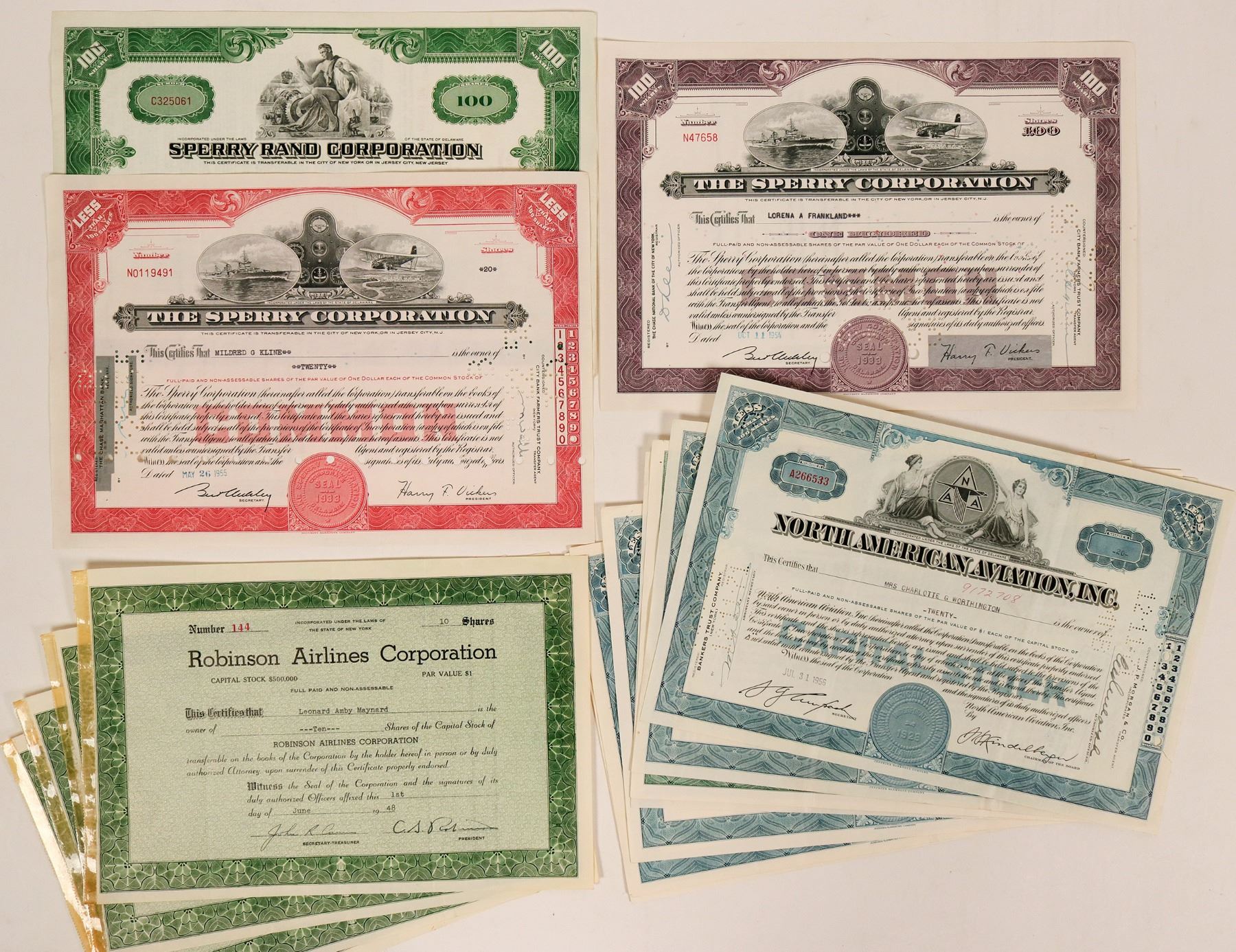 14 certificates. Four Robinson Airlines Corp. Incorp New York, Green, issued June 1948. EF. Two The Sperry Corp. incorp 1933 Delaware. EF. Purple, issued Oct 1954-56. One Sperry Rand Corp. Incorp New Jersey, Green, issued Dec 1956. Seven North American Aviation, Inc. Incorp Delaware 1928. Blue, issued Jul 1956. EF